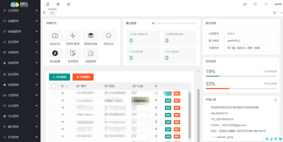 整个系统具备非常完善和丰富的功能。后台系统提供了会员管理、直播管理、短视频管理、音乐管理、礼物管理、贵族管理、资金管理、举报管理、文章管理、日志管理、平台管理、靓号管理、活动管理等多个功能模块,用户可以通过后台系统对直播APP进行全方位的管理。