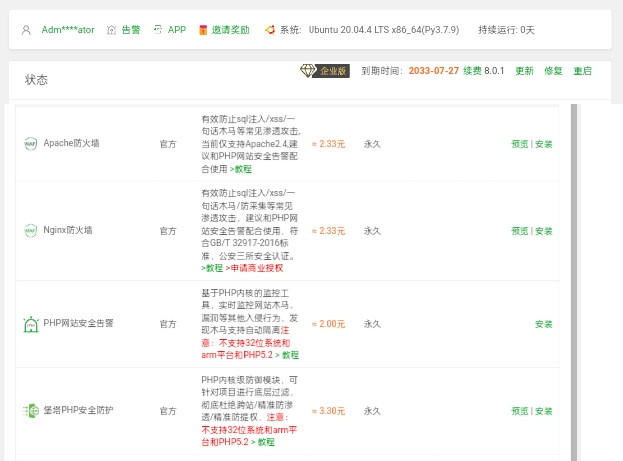 如果已经安装了官方版宝塔面板,可以执行以下命令来一键升级为企业版开心版: