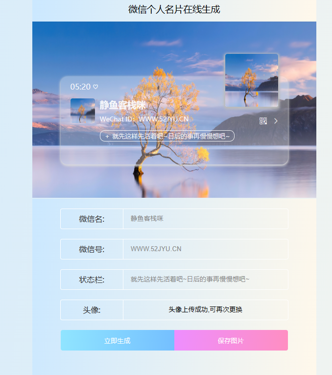 以下是微信个人名片H5生成器的HTML源码。该生成器无需第三方接口,可以直接在本地生成并长期使用。它主要用于生成用户个性化的名片页面,包括头像、姓名、联系方式、个人介绍等信息。只需在本地浏览器中打开即可使用,也可以上传到服务器上。