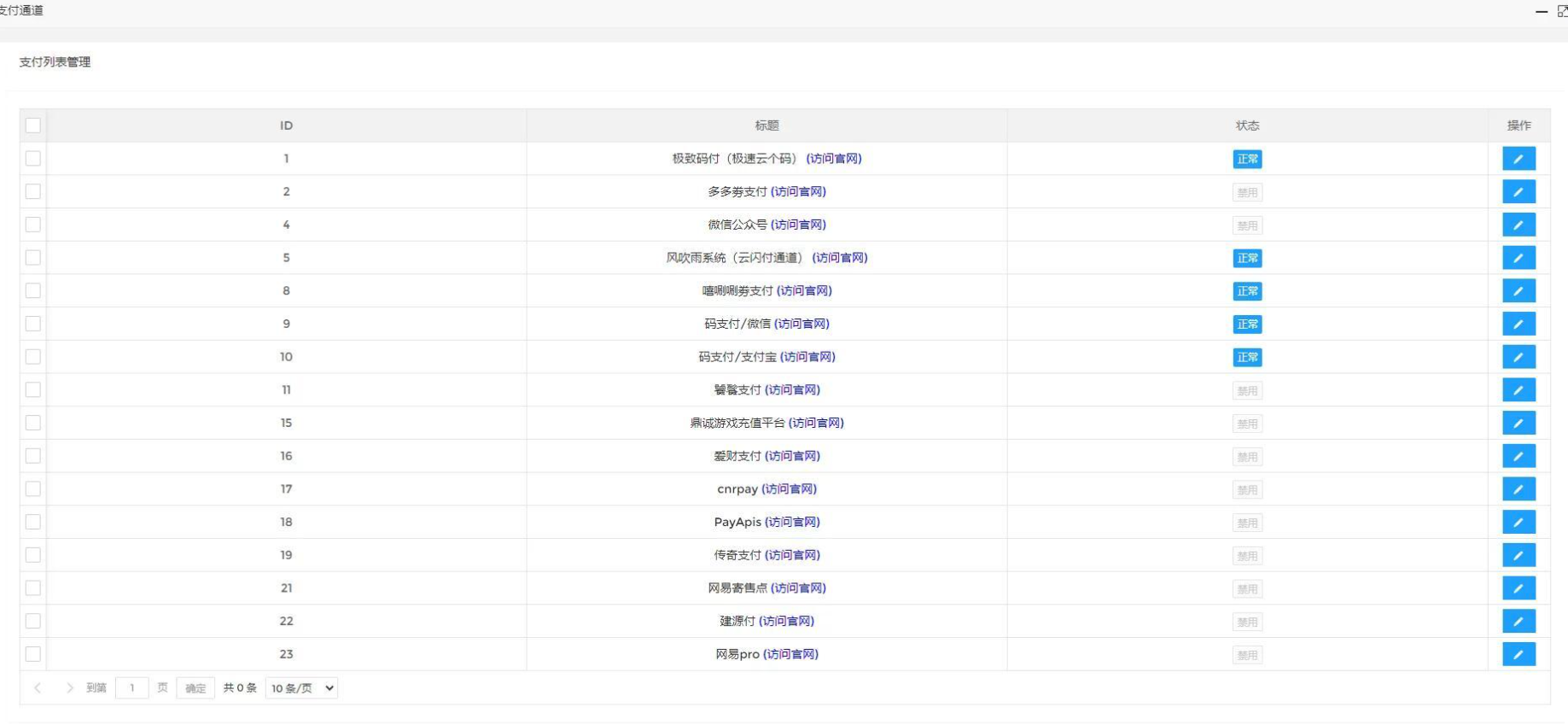 6. 系统内置了市面上常用的支付接口,一键配置,也可以添加新的支付接口。