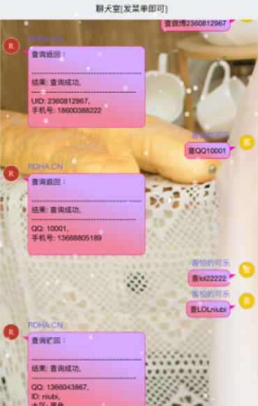 查绑聊天室源码–支持查Q绑、反查微博、LOL等多种功能 站长没有测试,自行测试吧~ 懂的都懂功能:///lol 全部功能请发送菜单 资源下载此资源仅限注册用户下载,请先登录客服QQ:305582964 联系邮箱:305582964@qq.com