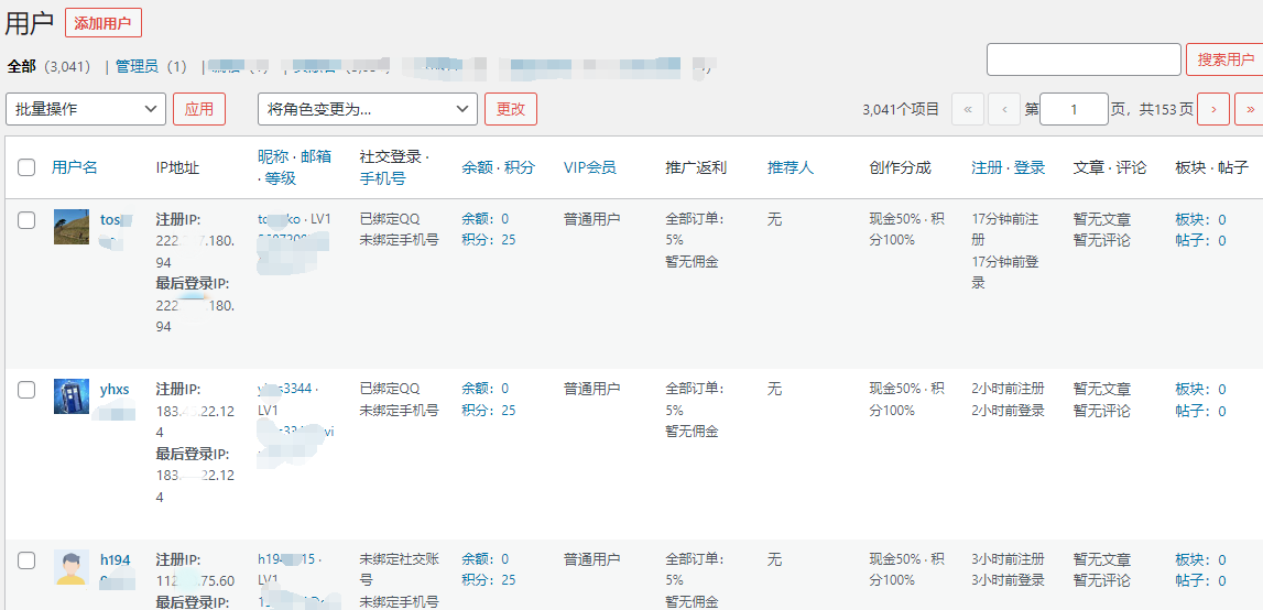 在wordpress后台用户页面显示出用户注册时的ip地址和最近登录时ip,这个功能还是非常重要的,比如上次博主博客遇到恶意刷积分,10分钟被邀请注册了几十个垃圾账号,来获取本站积分,如果能够在当时显示出注册时的IP地址,就能够及时的封禁IP!不至于花时间去查网站日志。