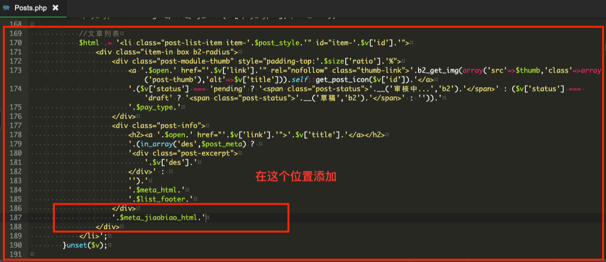 3.在第二步同文件中,大概167行的文章列表中添加以下代码: