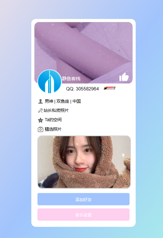 静鱼客栈 会员/推广/任务 超漂亮的个人主页仿QQ资料单页HTML引导页 https://wp.muooy.cn/25915.html
