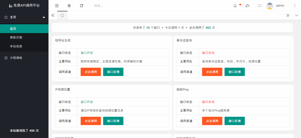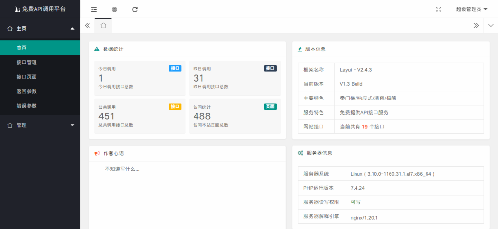 这里分享一个API接口网站源码,是某站长自己写的,代码写的不好,很多功能都没开始写,也会有些bug,嘿嘿,还写了个聊天室功能,虽然很多没写完,不过接口还是能用的,用layui框架写的!先上图看看吧!