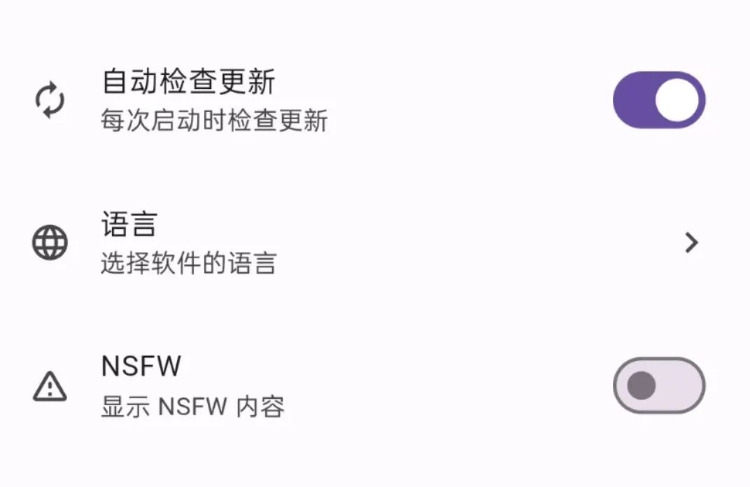 软件设置中甚至还有个名为NSFW的选项,一旦开启,可以发现一个全新的世界,想必老司机们对这个名字已经轻车熟路了,站长这里就不做演示了~
