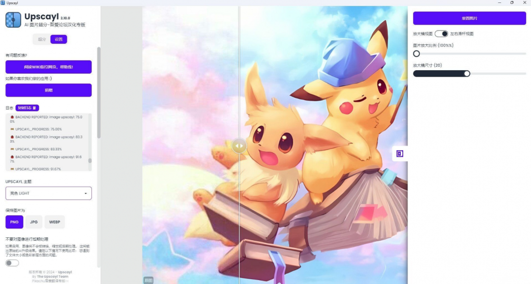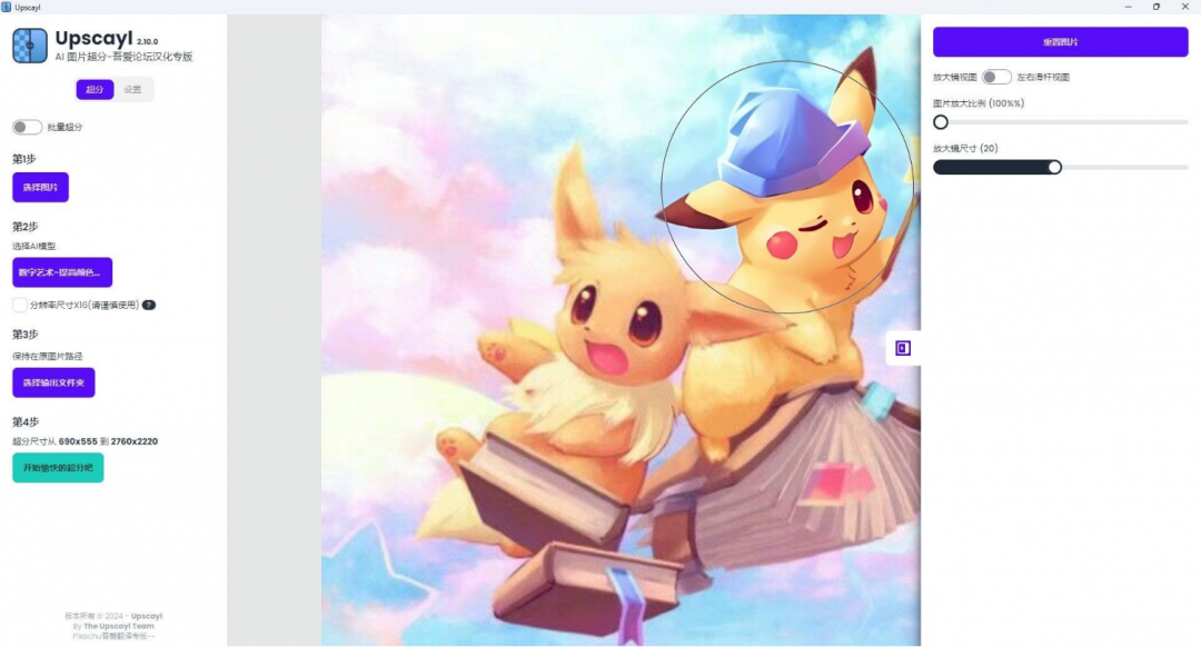 这次官方更新了Upscayl v2.10.0版本,除了原有的左右滑杆对比视图模式,添加了新的原图-AI效果图对比模式:放大镜模式,如图1所示,可以很方便的让大家使用放大镜的放大圈,直接对比区域内的AI超分结果,设置页也细化了很多选项。