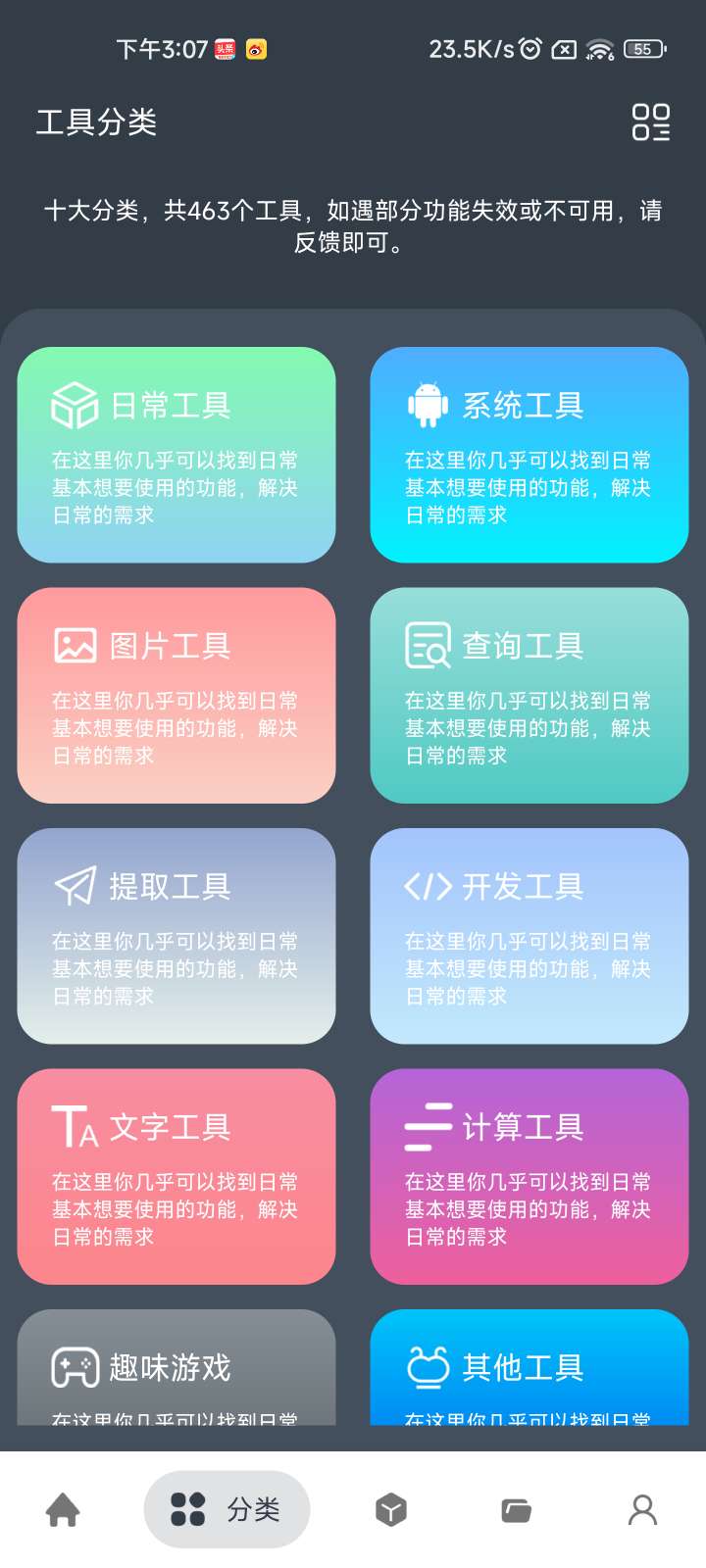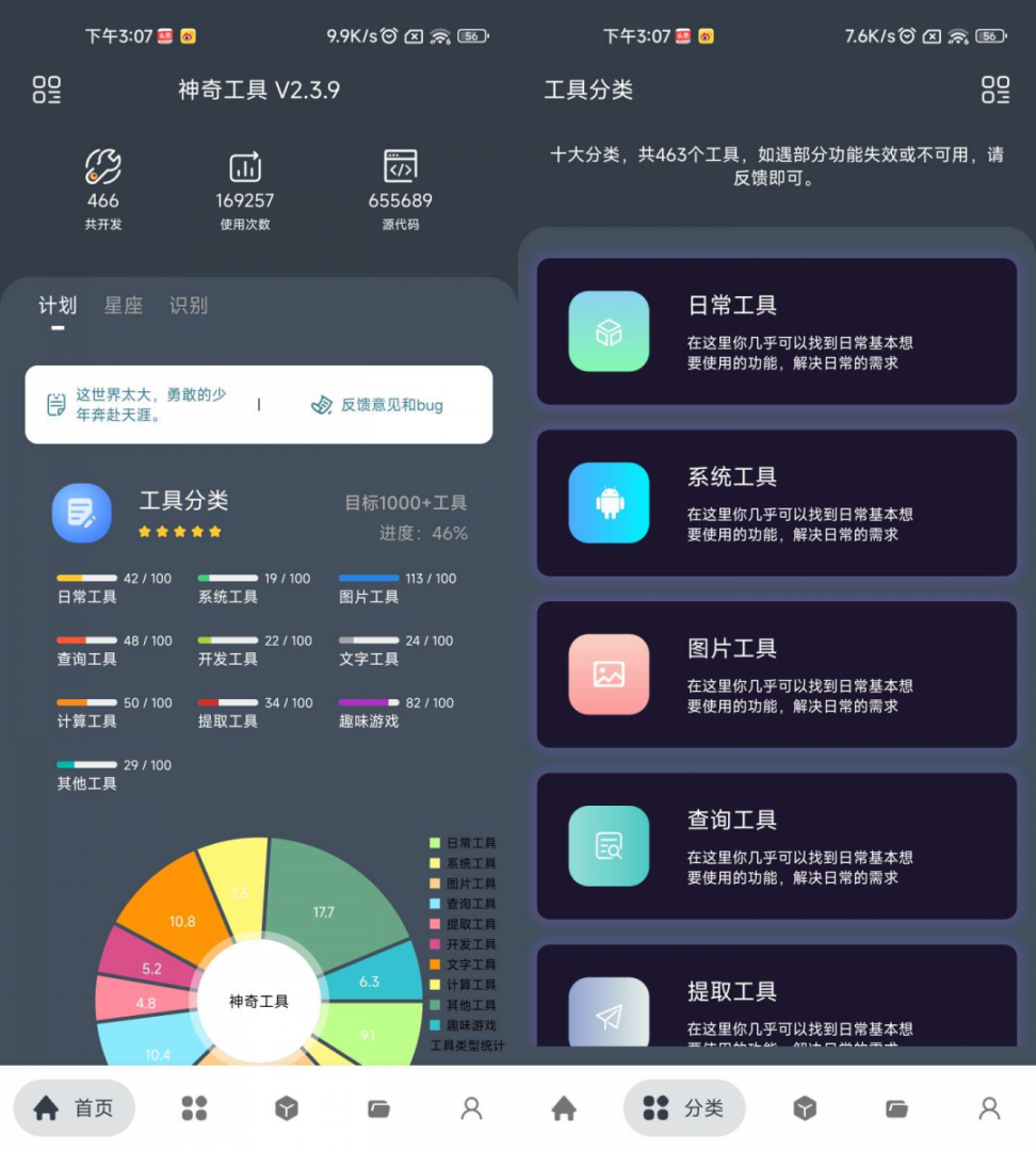 神奇工具 是一款安卓手机端使用的超级工具箱,该软件目标是提供1000+的实用型功能,目前已加入近500个功能!如果你认为它的功能太多,只为凑数,那就完全错了。该软件的功能每个经典,个个实用,使用后让你打开对工具箱新的认知!