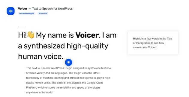 Voicer 是一款尖端的 WordPress 文本到语音插件,它利用先进的机器学习和人工智能技术将文本转换为类似人类的语音。