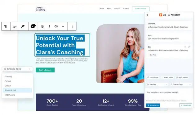 除了创建快速加载和视觉上吸引人的网站外,Spectra还与Zip AI合作,帮助您撰写引人注目的网站文案,翻译内容,并回答与WordPress相关的问题。