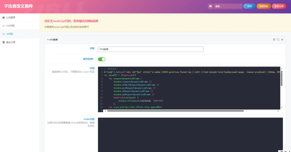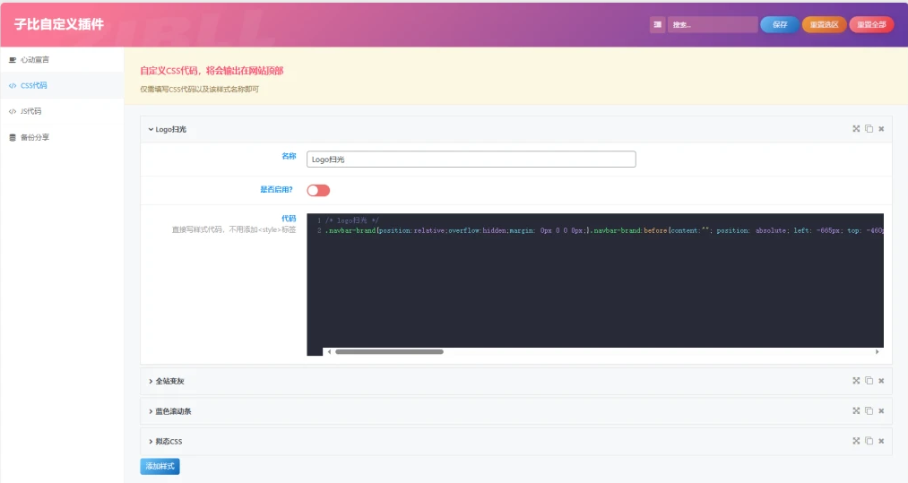 用于提供给不会写美化插件的小白用户,让小白也能自己制作一个属于自己的美化插件,支持每个css、js的开启或关闭,填写名称进行备注更加方便查找,让功能 “活” 起来,在需要时开启,在不需要时关闭