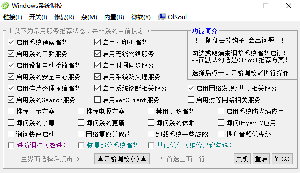 OlSoul是一款能够适配用于win各个系统的系统调校软件,OlSoul内置有众多调校功能可以直接使用,比如有启用无线网络功能、启用打印机功能、系统快速休眠与休眠开关、快捷方式小箭头去除功能等等,具体的调校功能多达几十项,可以自由的使用,方便用户对系统更好的调校设置。