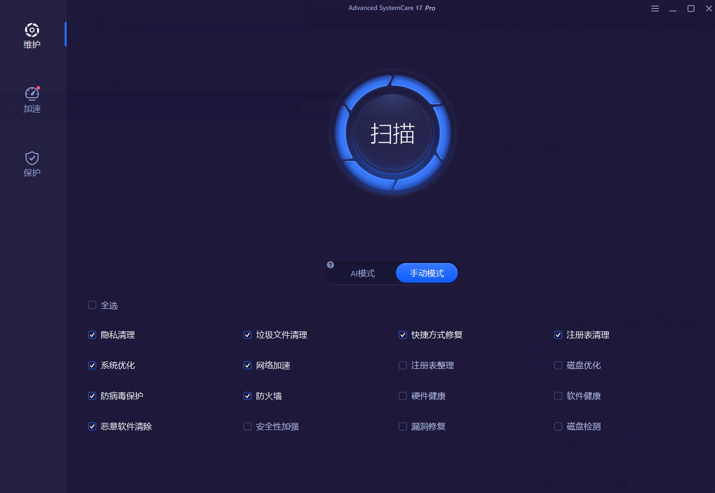 Advanced SystemCare是 IObit 公司开发的一款易于使用的 Windows 电脑优化工具,是难得一见的高性能优化工具。它能对系统进行全面的诊断,在找到问题根源后有针对性地进行修改、优化,优化后系统性能和网络速度都会有明显提升,它的安装非常简便无须太多复杂的设置,简单配置后即可使用。