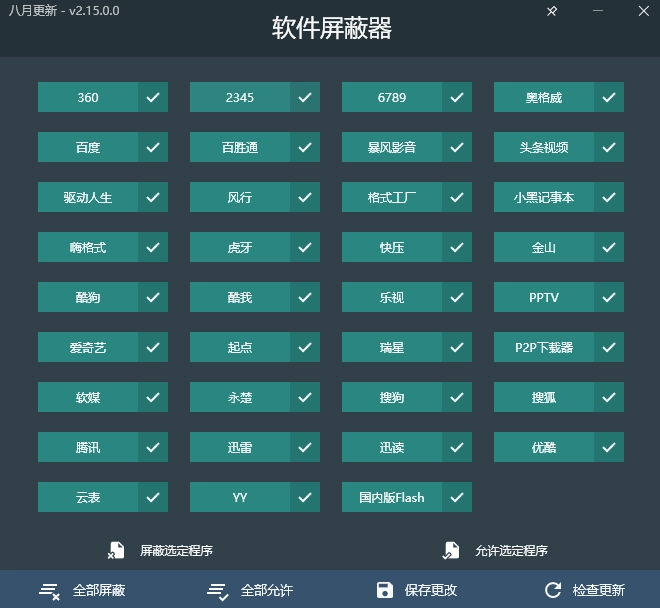 一款免费可以阻止常见的国产流氓软件的管理员授权的软件。其原理是直接拉黑软件的证书,无需后台运行,一键阻止常见流氓软件的管理权限,主要目的就是快速屏蔽常见的国产全家桶软件,包括360、2345、腾讯等系列软件,可以说是相当给力的。时隔几个月,终于更新了。