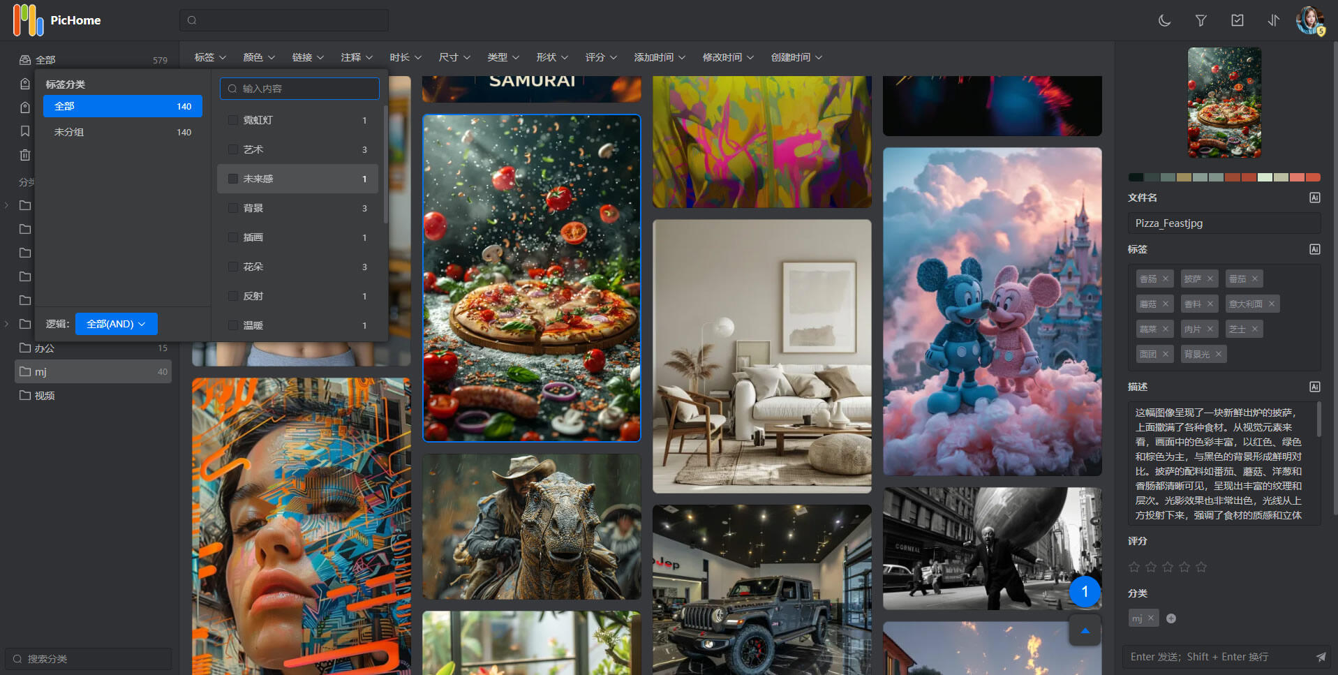 - PicHome:支持自动获取图片的颜色、形状等属性,以及音视频的时长等信息,并允许用户添加二级标签、文件描述和评分,从而实现多维度、深度的文件管理。