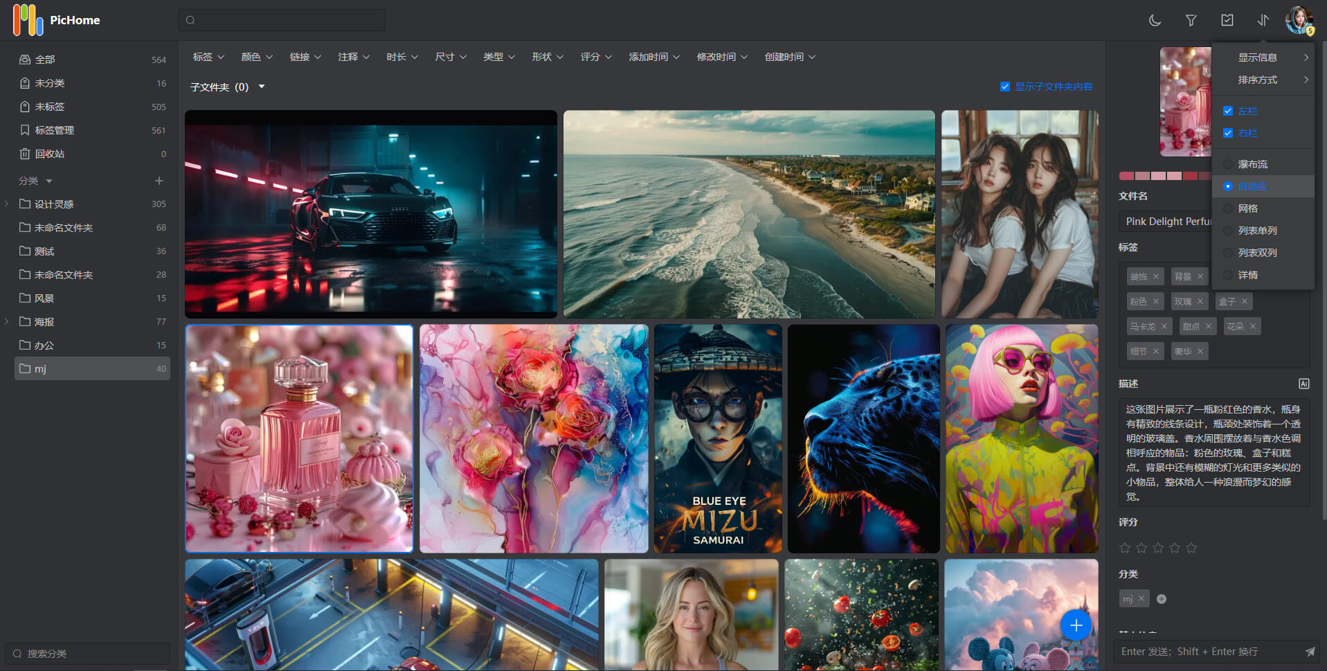 - PicHome:提供包括瀑布流、自适应布局、网格、列表、双排列表和详细视图在内的多种模式,以适应不同用户的视觉和操作体验。
