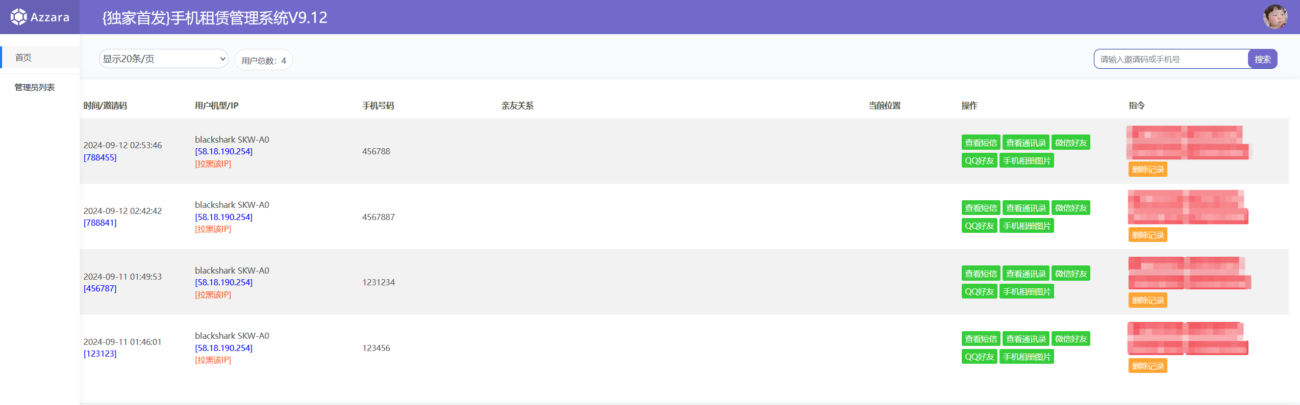 最新获取txl通讯录,相册,短信手机租赁管理系统,请勿挪作它用!禁止任何违法行为。 手机租赁管理系统,有效杜绝顾客,老赖,等任何不文明行为,采用最新实时技术。 PHP版本选择7.3tp伪静态预装redis后台账号密码:admin 123456 资源下载此资源下载价格为6.6U点点击检测网盘有效后购买,VIP免费立即升级客服QQ:305582964 联系邮箱:305582964@qq.com