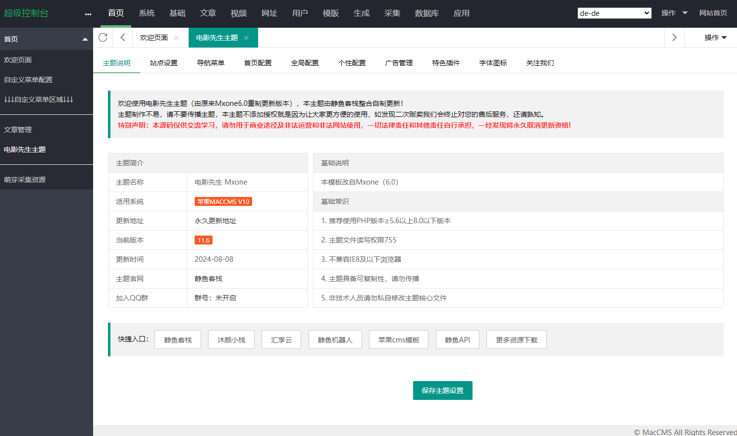 电影先生Mxone魔改主题带有完整的后台管理,支持白昼切换、首页自定义、自定义幻灯片、导航自定义、侧边导航自定义、手机导航自定义、横向图展示、独立解析设置、明星页、专题页、资讯页、个人中心、下载页、直播页、详情页、手机自适应等苹果cms模板该有的功能基本都有。