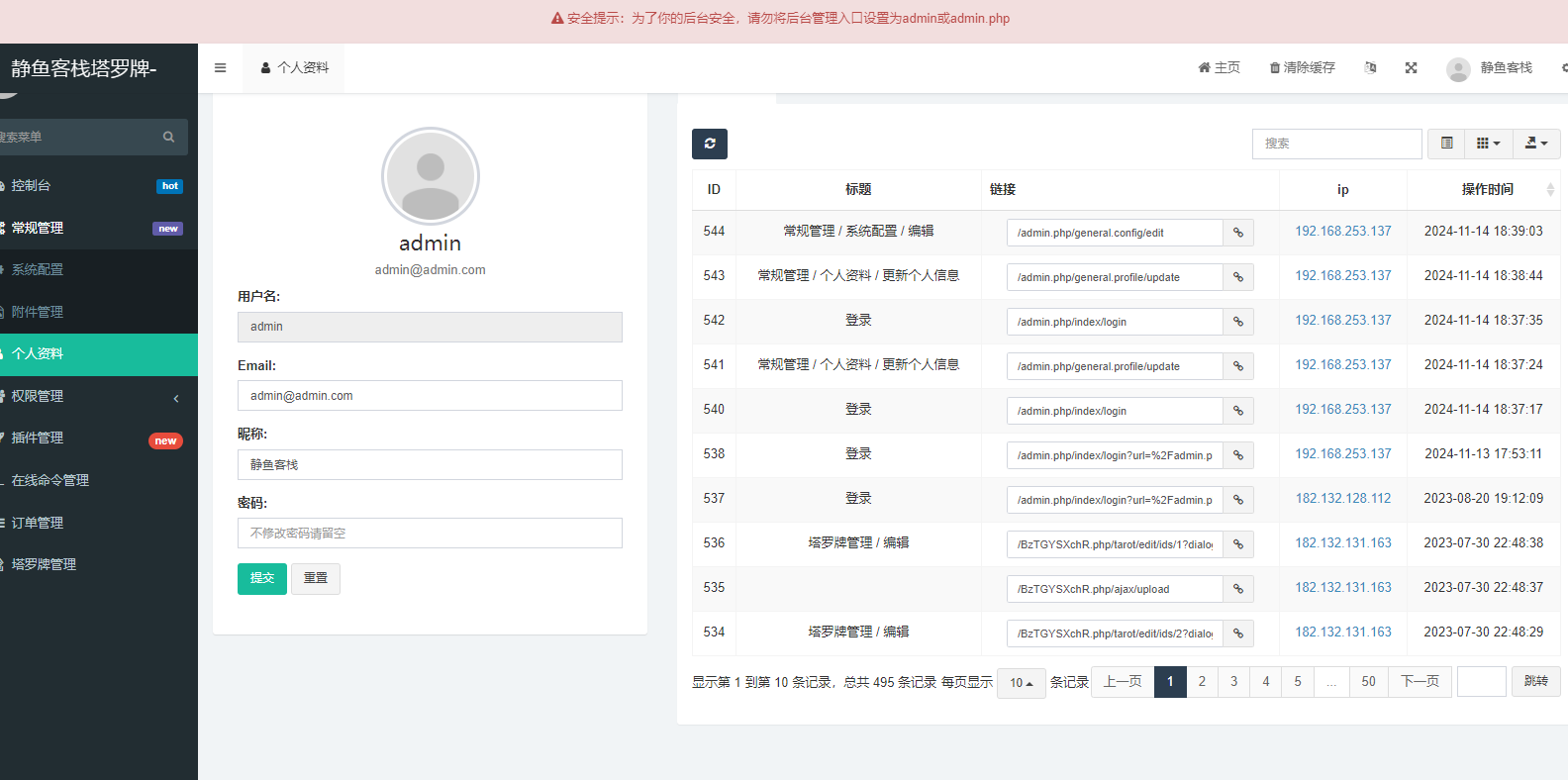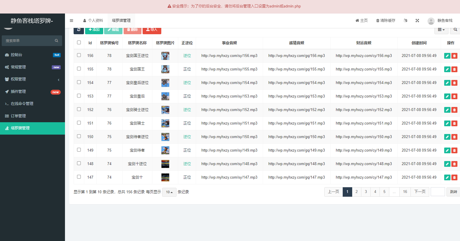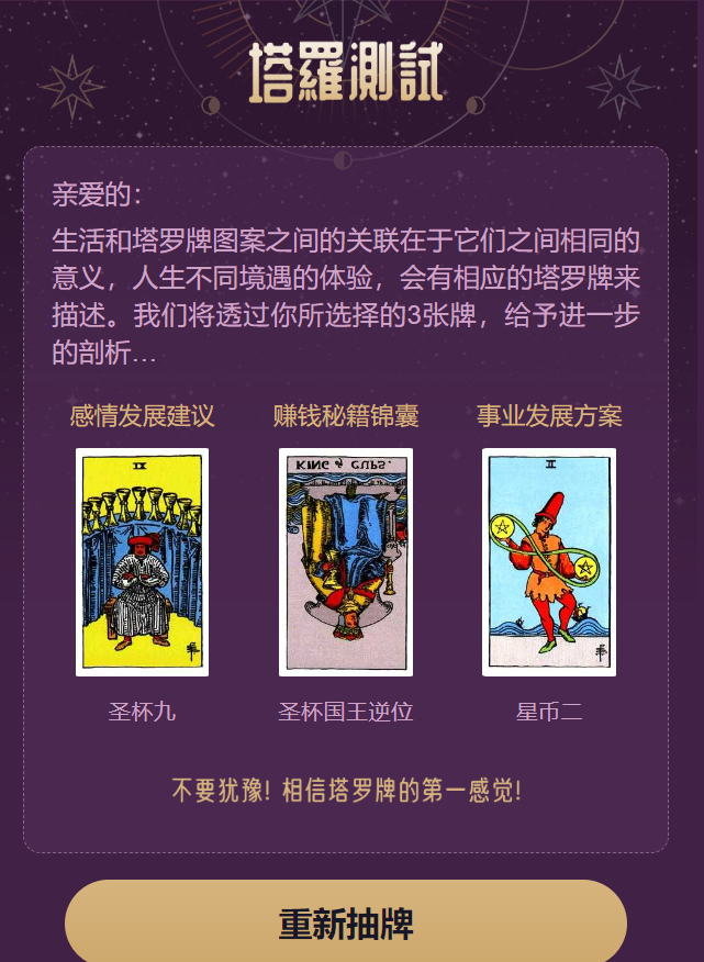 站长测试了一下,可以使用的,不过因为数据库没有对接用户系统,所以首页的用户中心点了会报错,不过不影响使用,其他的没什么大问题,就相当于用的TP框架 加载的塔罗占卜插件,需要的可以看看。
