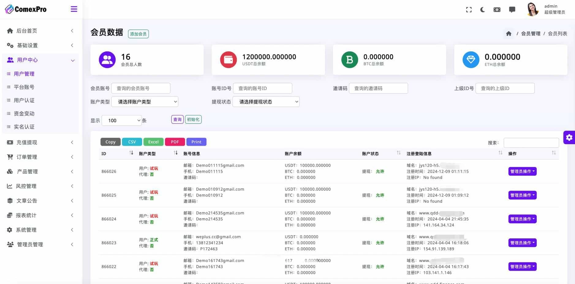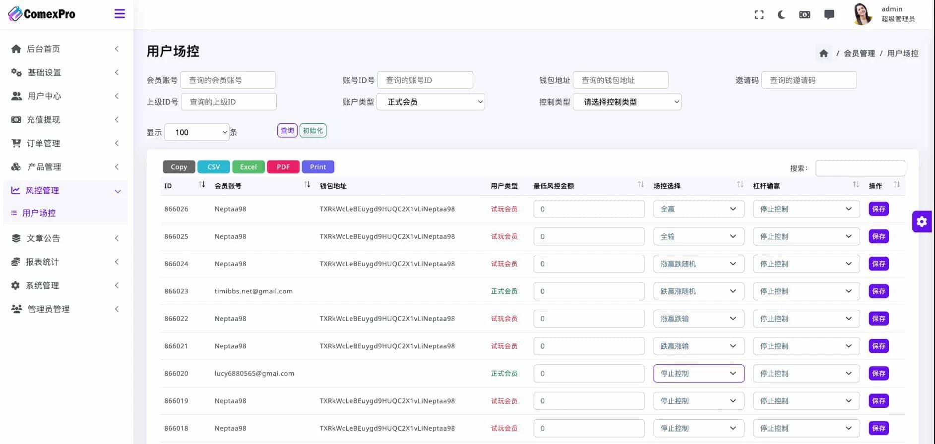 控制分为用户场控(全赢、全输、涨赢跌随机、跌赢涨随机、涨赢跌输、跌赢涨输),杠杆交易也可以控输赢