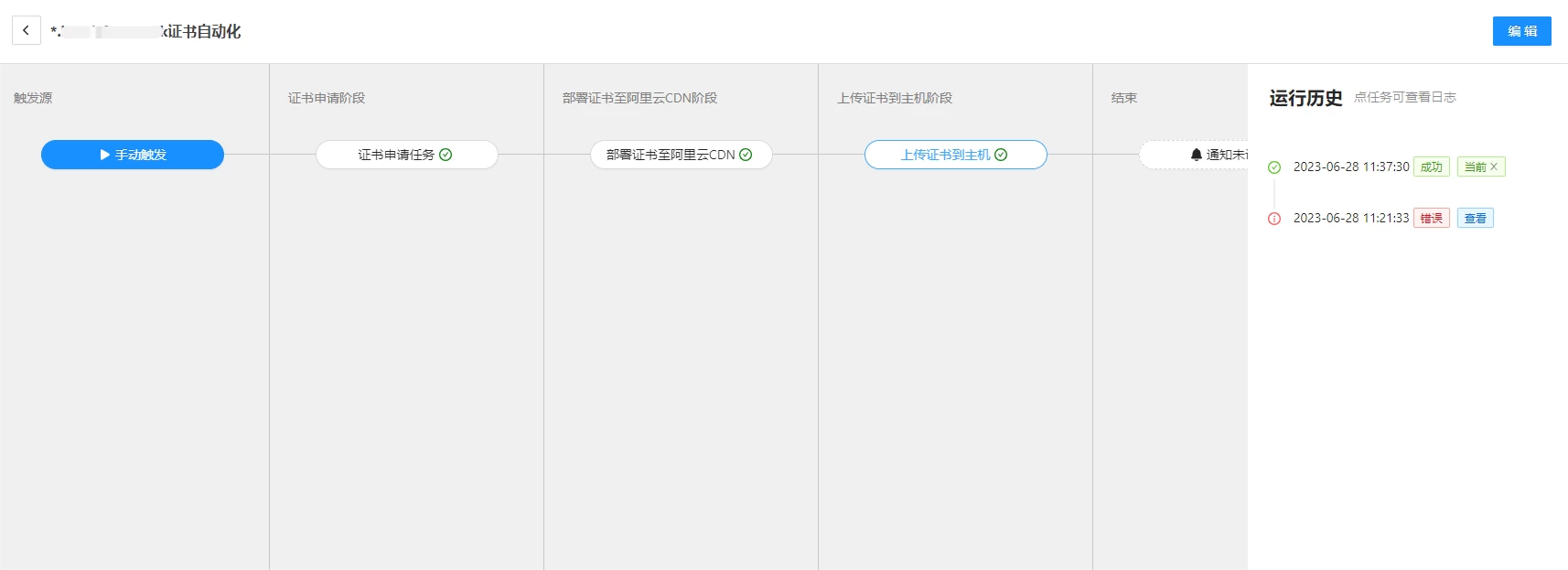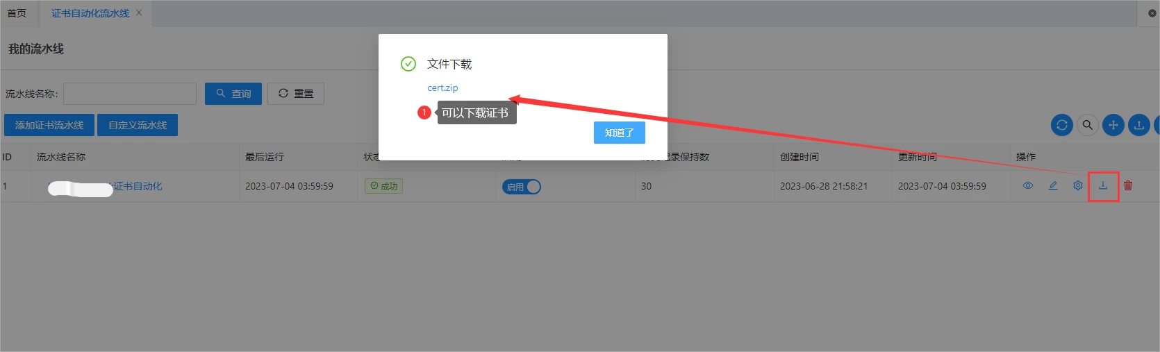 添加成功后,流水线将自动运行,申请 SSL 证书。