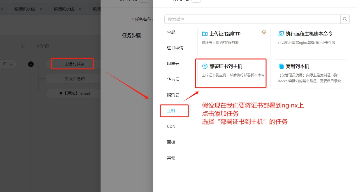 Certd 支持多种部署插件,如 Nginx、阿里云、腾讯云、Kubernetes、CDN、宝塔、1Panel 等,您可根据实际需求选择适合的部署方式。如果现有插件无法满足需求,也可手动下载证书进行自定义部署。