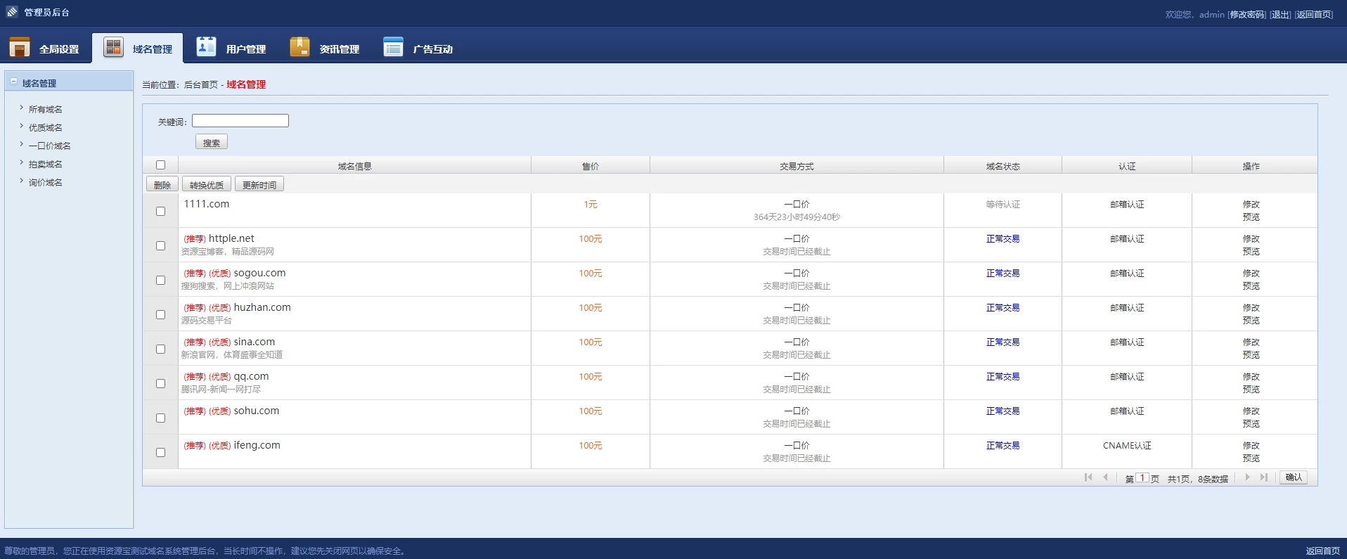 最新修复版域名出售交易平台源码,搭建即可正常使用,后台功能测试正常,前台测试正常