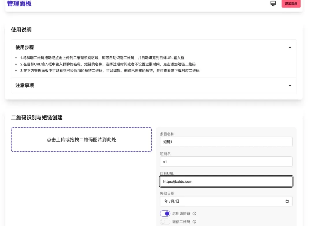 • 管理后台:提供管理后台,用户可以随时更新二维码和短链接信息。