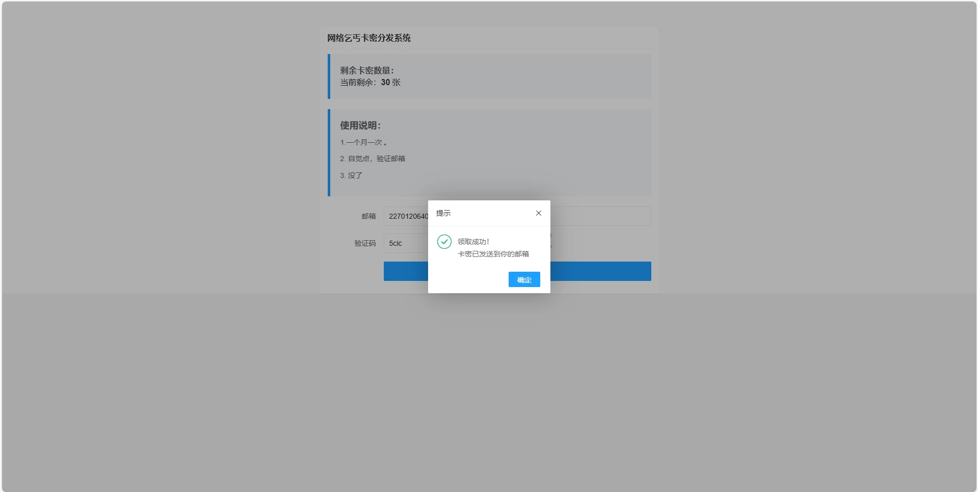 - 前台:直接访问域名就可以到达前台,使用邮箱进行领取。领取需要输入验证码,防止多次请求接口造成接口拥堵