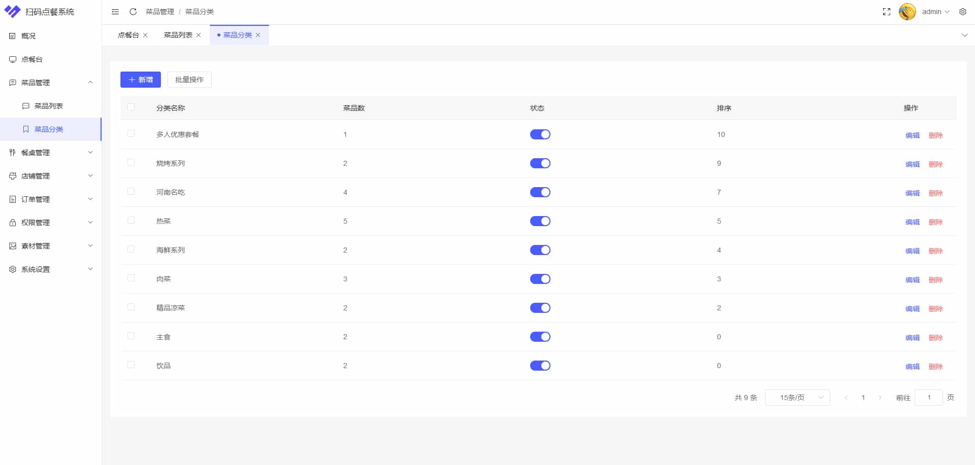 菜品分类管理:设置菜品包含的分类,商户点餐端可以根据分类快速查找商品,同时顾客点餐端也会根据菜品分类展示菜品。