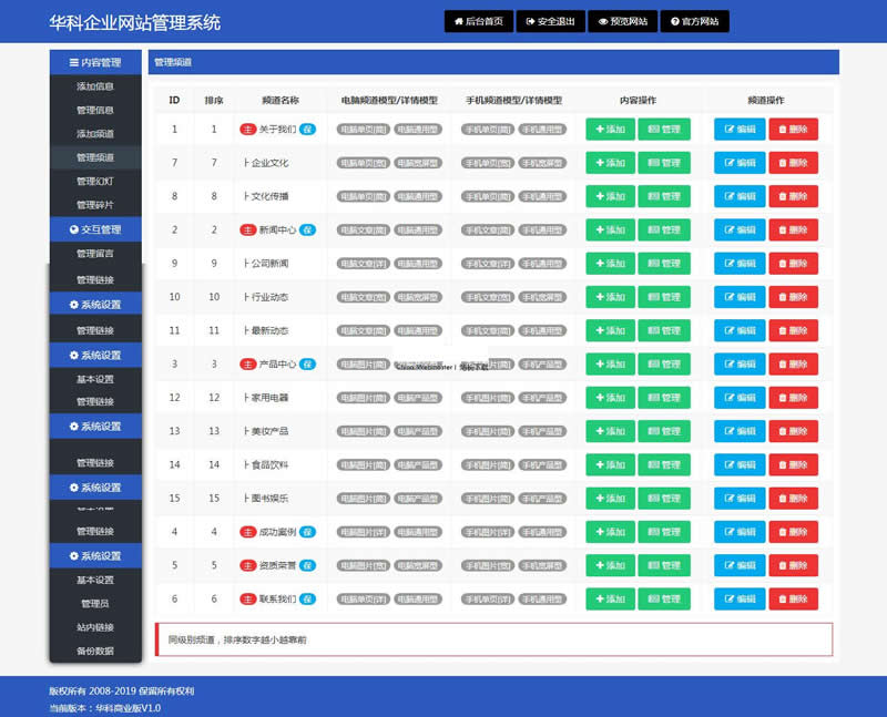 华科具有强大的后台管理功能,菜单栏目划分合理清晰。产品、新闻等功能均支持多级分类划分。支持3种PC模板+3种手机模板切换,可供用户自由选择,适合各行各业使用,各模板均精心开发、界面美观时尚、动感十足!