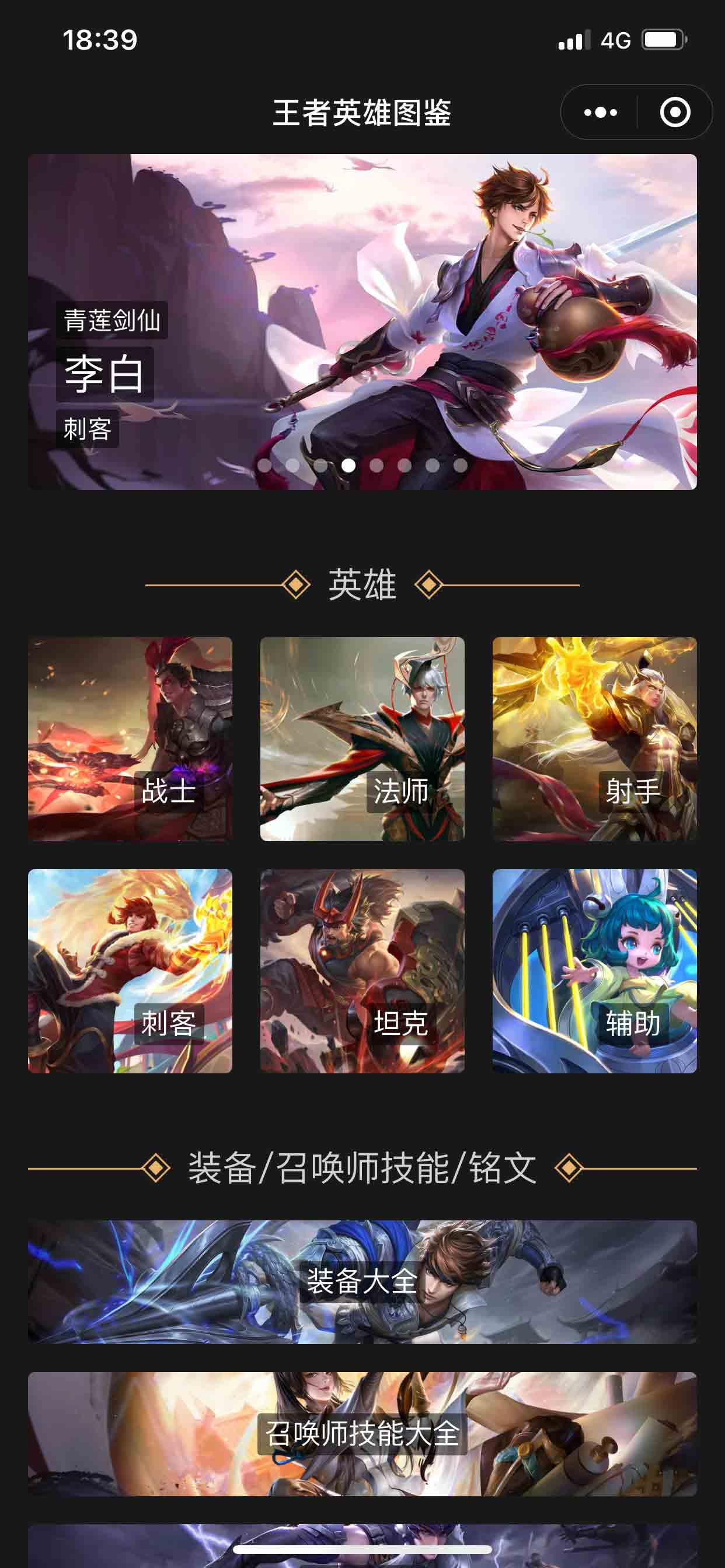 王者英雄图鉴是一个关于王者荣耀英雄介绍的小程序,还有装备、召唤师技能、铭文。英雄有六个分类,分别为战士、法师、射手、刺客、坦克、辅助。英雄详情里包含了所有皮肤封面,以及英雄技能、属性、出装和铭文,进入英雄详情时还会播放台词。小程序同时还适配了深色模式。