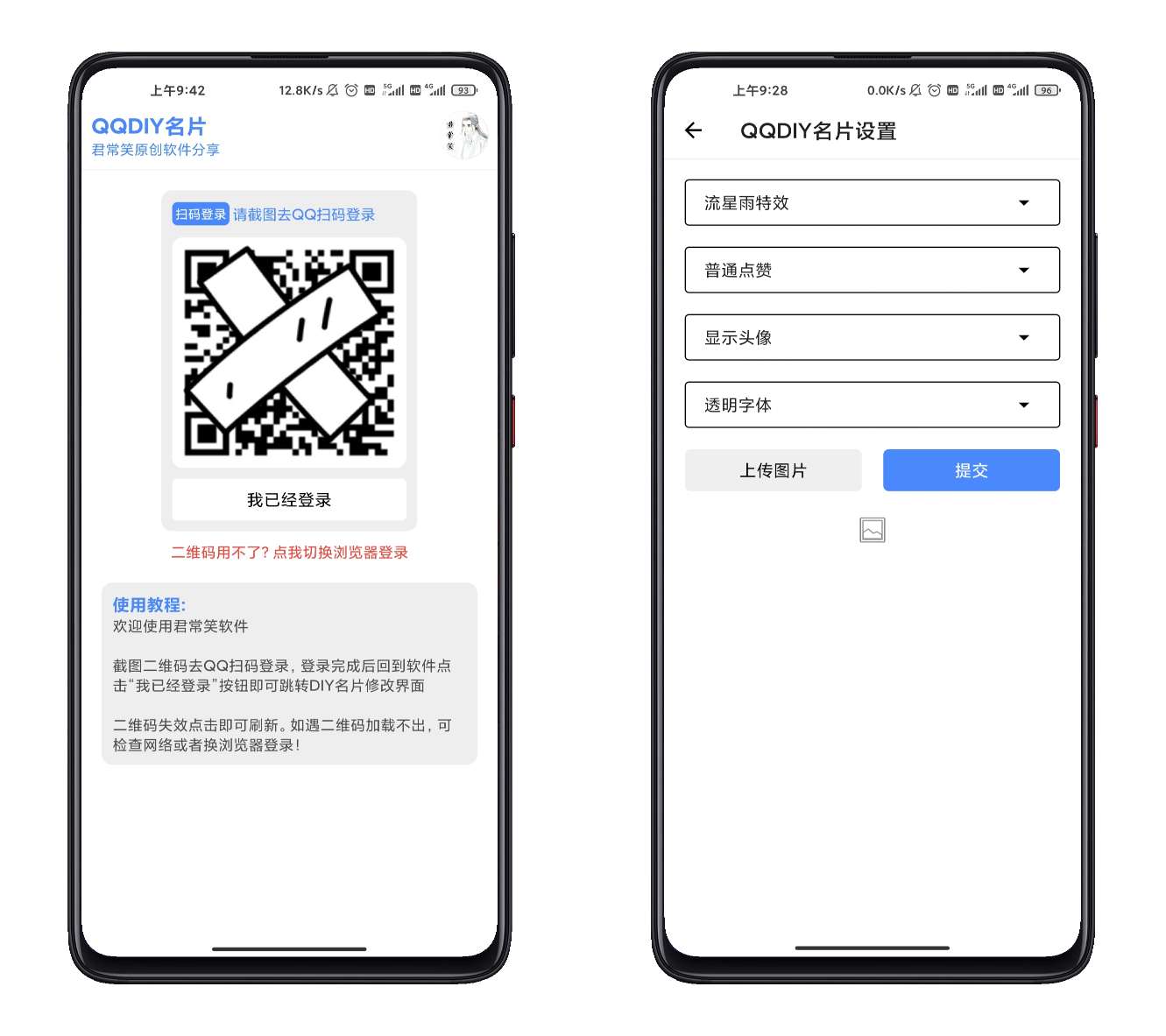 本软件为“QQDIY名片”由君常笑原创开发,无需root,无需插件,无需代码,一键设置修改DIY名片资料卡,自定义显示隐藏头像点赞,还有各种特效,喜欢可以可以试试哦。
