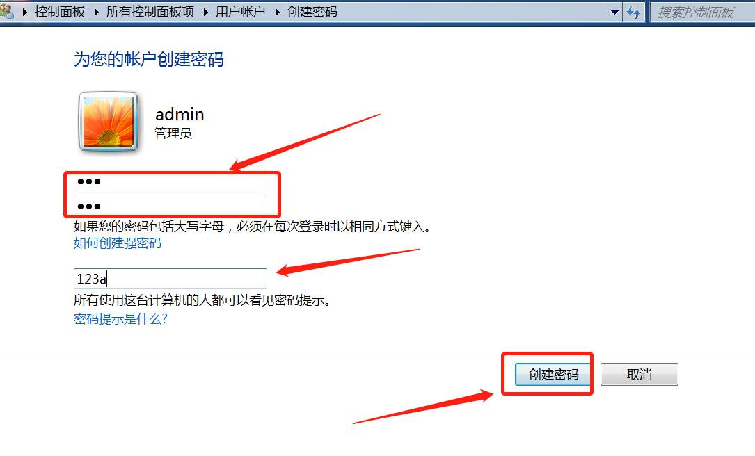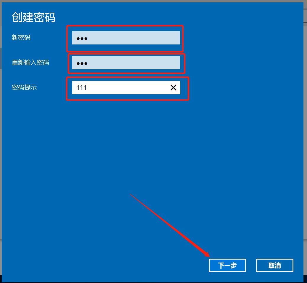 第四步:在弹出的“用户帐户”窗口中输入暗码与暗码提示,然后点击“创立暗码”