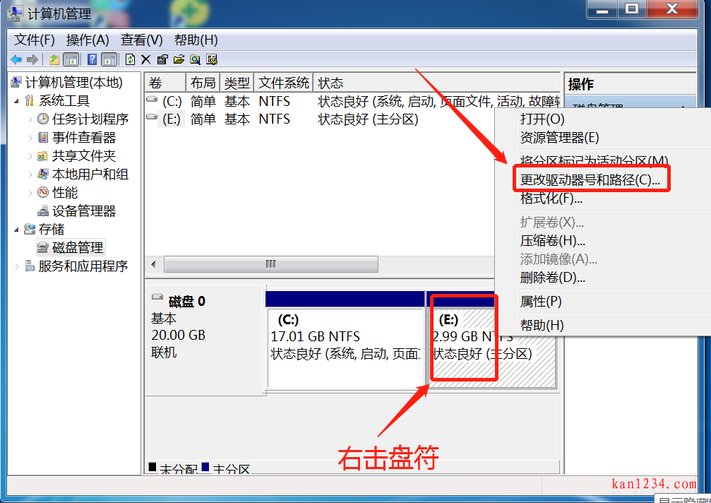 第三步:在窗口的中心右击你想要修正的盘符,这儿我是修正E盘,所以我右击了E盘,然后点击”更改驱动器号和途径(C)”.