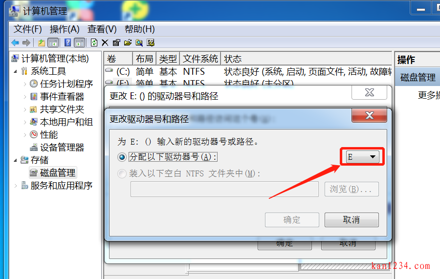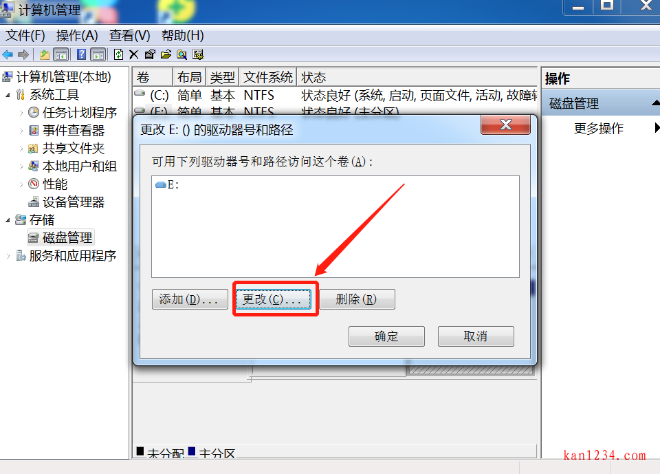 第四步:在翻开的”更改E:()的驱动器号和途径拜访这个卷(A)”窗口中点击”更改”.