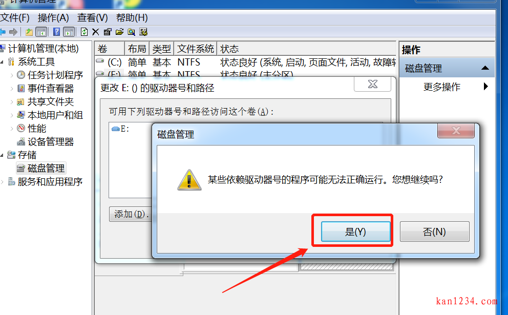 第六步:这时会弹出一个对话框问询你”某些依赖驱动器号的程序可能无法正常运行.你相持续吗?”(备注:这儿你要注意,如果你安装了程序在E盘,这时你把E盘改成D盘,很有可能以前的程序快捷键是指向E盘的,可能会有些程序打不开),我这儿点”是”.