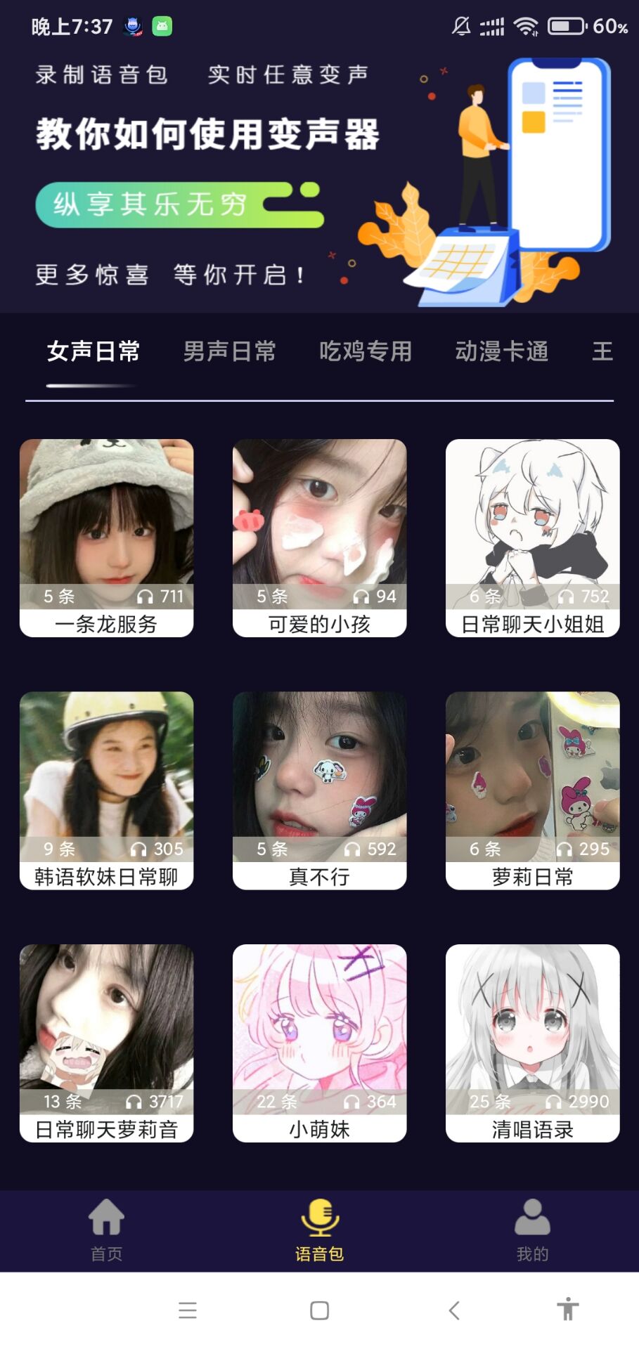 适用于聊天、游戏、语音通话等场景!聊天交友游戏开黑专属。你在这里不仅可以听到喜欢的明星爱豆语音,更有戏精正太萌妹御姐等不同语音包,让喜欢的声音击中你的灵魂深处。