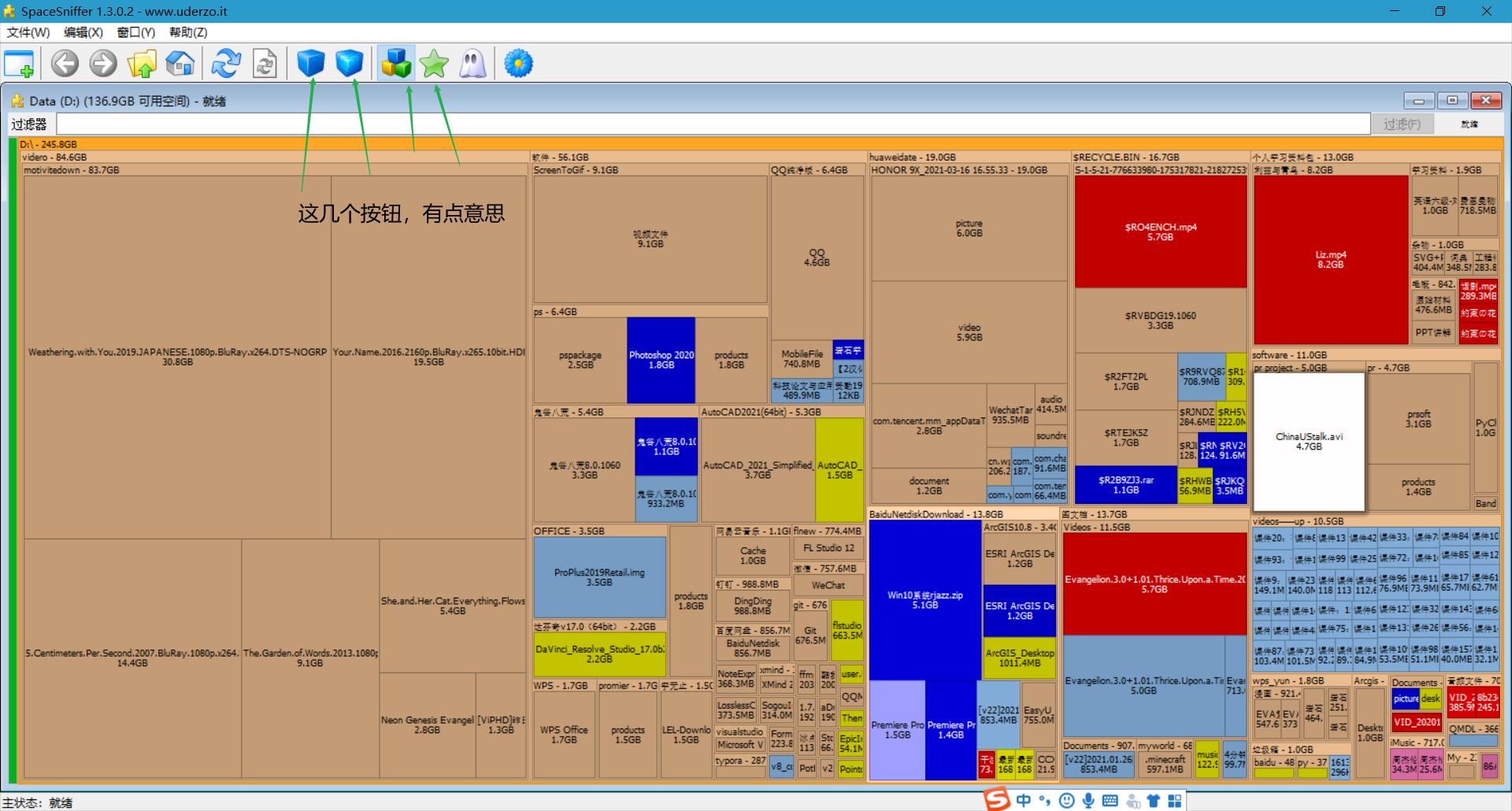 另一方面,看到那几个图标了没有,文件看着密密麻麻的?去挨个儿点一下,你会看得更清楚一点