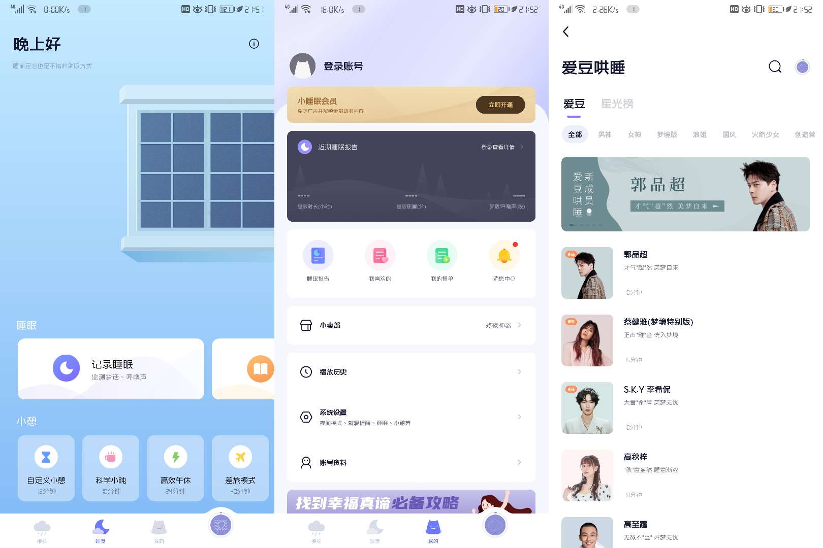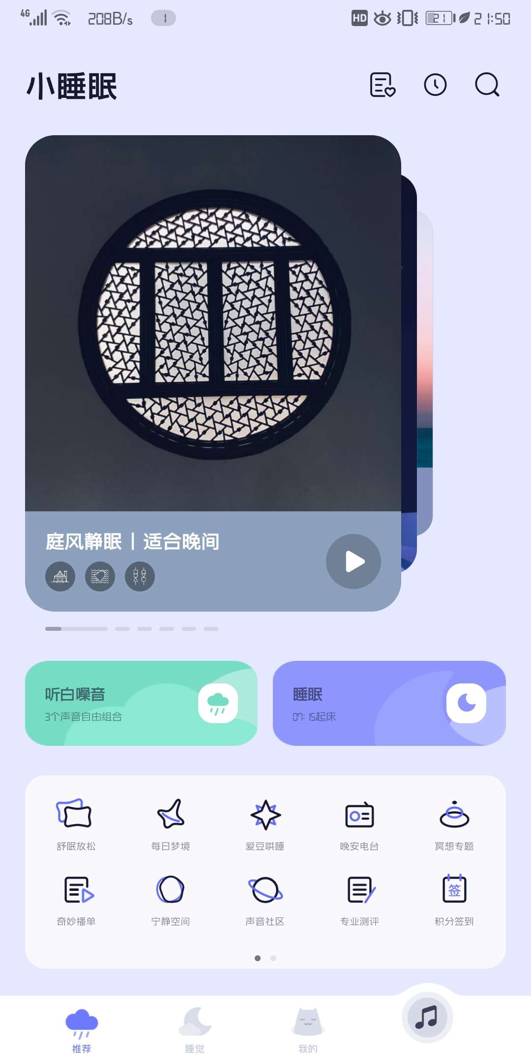 小睡眠提供白噪音丶冥想音乐、爱豆哄睡、睡眠监测、梦话录音和智能闹钟等功能。
