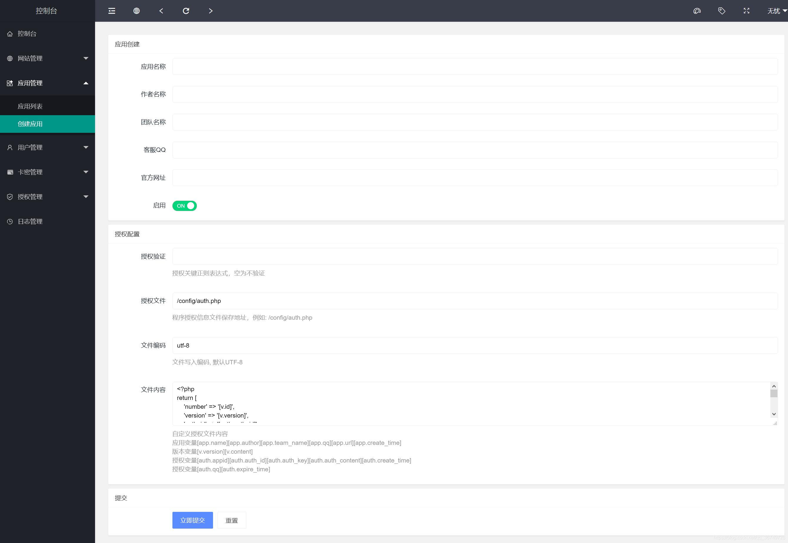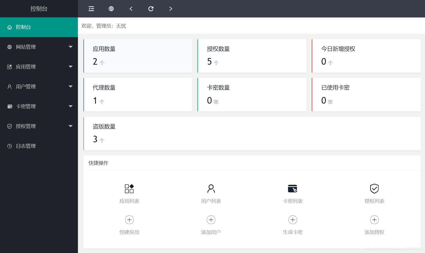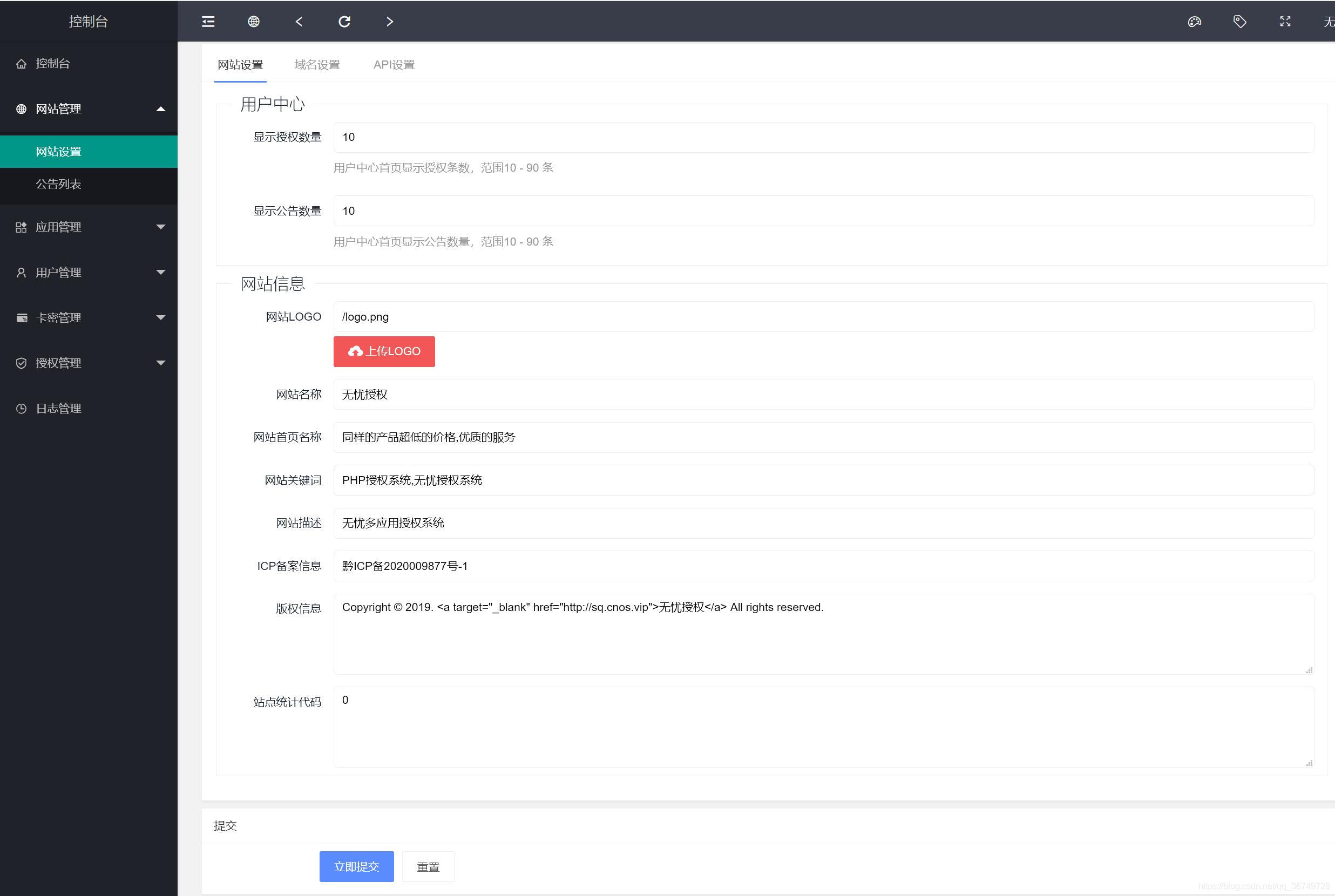 注意:此授权系统授权代码请参考/public/demo/文件夹下的好几个文件,不是一句代码放在被授权的程序里面就行的,小白勿扰, 小白勿扰,请自行研究,某站卖588元的源码,我们低价提供给有需要的人研究,不提供技术支持 本程序支持多应用添加; 后台可以单独设置后台域名,用户中心域名,首页域名,API域名; 支持自行控制是否只需要授权主域名,还是字域名都要授权; 添加应用,支持自行输入名称,作者,团队名称,客服QQ,官方网址等等; 支持卡密生成授权; 支持三级区别, 一级权限:可以生成卡密授权,以及可以添加,二级,三级代理; 二级权限;可以生成卡密授权,可以添加三级; 三级权限;只可以后台授权; 前台支持授权查询,卡密在线授权,代理查询,一级应用列表; 下载源码支持授权QQ扫码下载