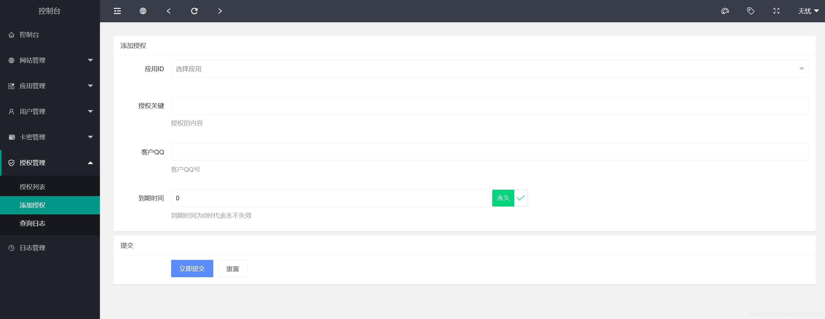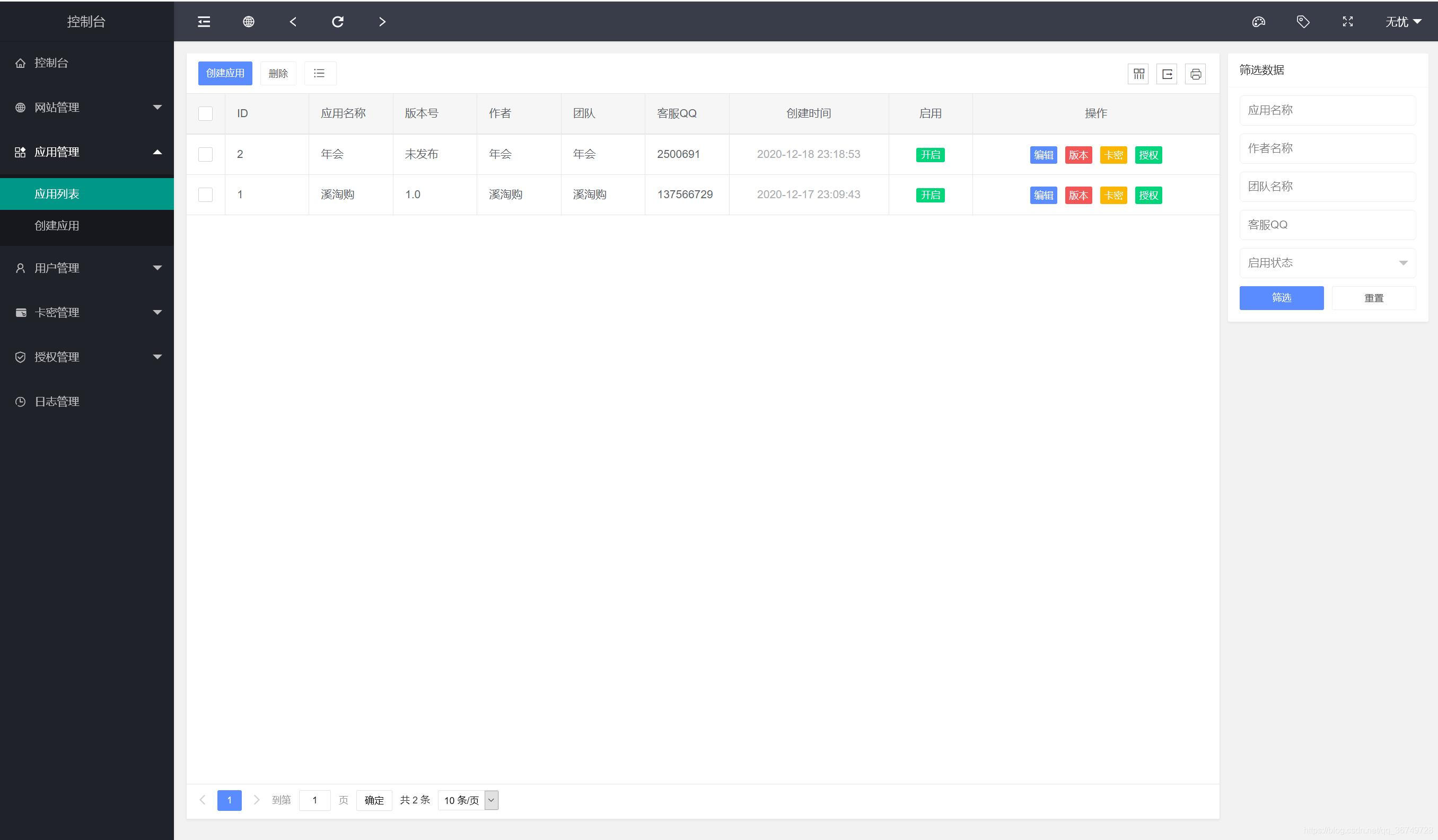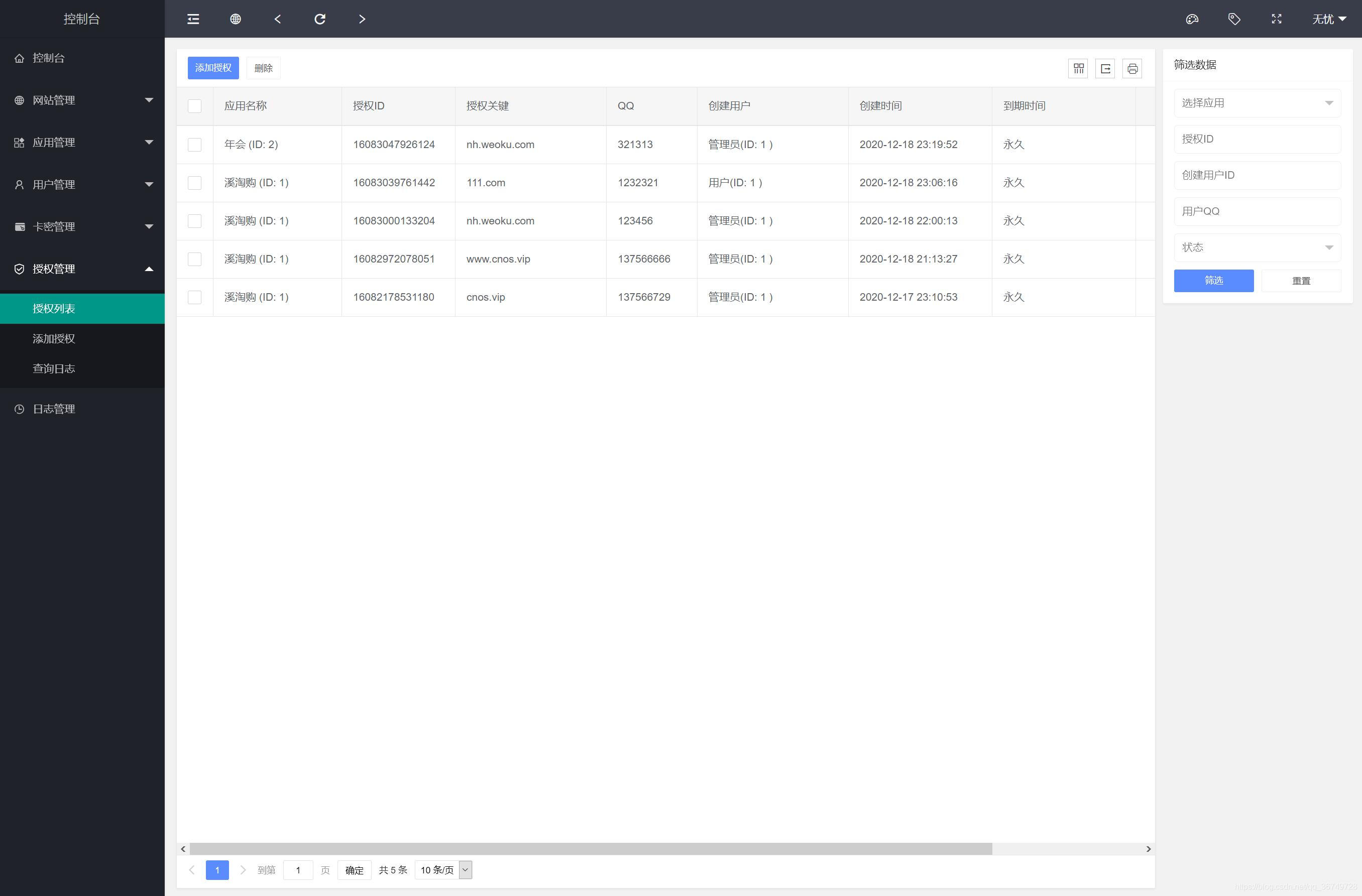 注意:此授权系统授权代码请参考/public/demo/文件夹下的好几个文件,不是一句代码放在被授权的程序里面就行的,小白勿扰, 小白勿扰,请自行研究,某站卖588元的源码,我们低价提供给有需要的人研究,不提供技术支持 本程序支持多应用添加; 后台可以单独设置后台域名,用户中心域名,首页域名,API域名; 支持自行控制是否只需要授权主域名,还是字域名都要授权; 添加应用,支持自行输入名称,作者,团队名称,客服QQ,官方网址等等; 支持卡密生成授权; 支持三级区别, 一级权限:可以生成卡密授权,以及可以添加,二级,三级代理; 二级权限;可以生成卡密授权,可以添加三级; 三级权限;只可以后台授权; 前台支持授权查询,卡密在线授权,代理查询,一级应用列表; 下载源码支持授权QQ扫码下载