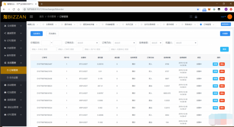 核心功能说明(管理端) 1. 概要(查看平台运行数据,包含交易额、注册人数、充值等) 2. 会员管理(会员信息管理、会员实名审核、会员实名管理、会员余额管理、会员充值/冻结余额等) 3. 邀请管理(会员邀请信息、会员邀请排行管理) 4. CTC管理(CTC订单管理、流水管理、承兑商管理) 5. 内容管理(PC广告管理、APP广告管理、公告管理、帮助管理) 6. 财务管理(充值提现管理、财务流水管理、对账管理、币种钱包余额管理) 7. 币币管理(新建交易对、管理交易对、新建交易机器人、设置交易机器人参数、设置行情引擎/交易引擎、撤销所有委托) 8.活动管理(新建活动、矿机认购、抢购/瓜分管理) 9. 红包管理(平台红包管理、用户红包管理) 10. 系统管理(角色管理、部门管理、用户管理、权限管理、币种管理、RPC管理、版本管理) 11. 保证金管理(此功能设计时考虑到,但实际运营期间未使用到) 12. OTC管理(广告管理、订单管理、OTC币种管理、退保管理等,此功能未获得实际运营检验)