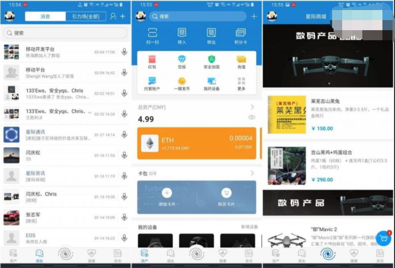 其他 空间(“引力场”)动态的发送、展示、评论互动功能; 数字货币的资产管理、转账功能; 数字货币的行情、K线图实时展示; 新闻资讯服务; 商城系统; 支持多语言 支持换肤