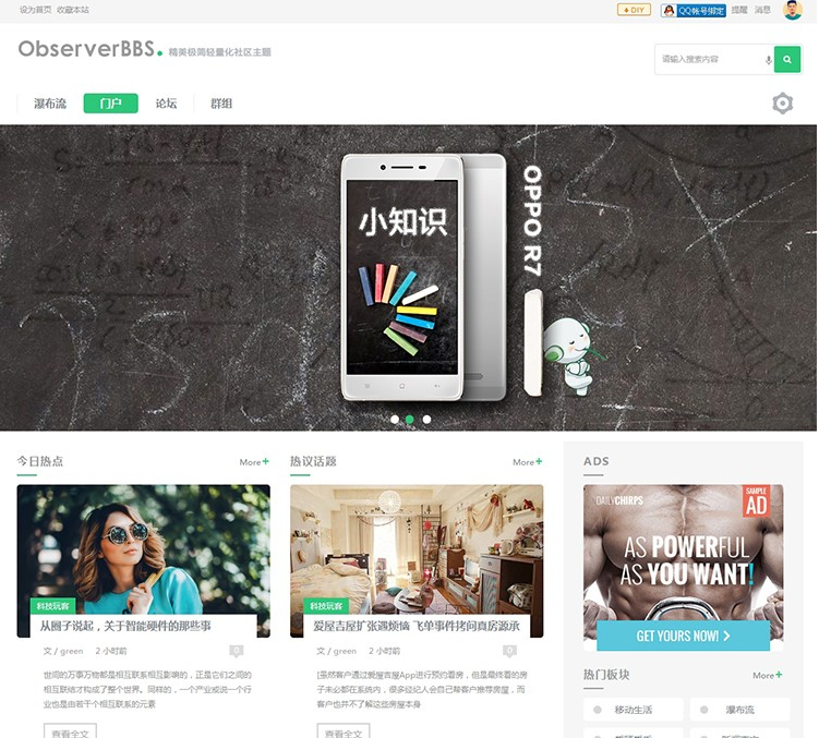 模板论坛首页,列表页,内容页,以及文章页面数据采用DIY数据读取,方便新手老手运营以及后期维护,时尚大气简洁。模板添加了不少处动画效果,增加用户体验和粘度。 模板对css3支持很多,用谷歌火狐以及ie9版本以上的朋友可以看到不错的动画效果。 资源下载此资源下载价格为2.2U点点击检测网盘有效后购买,VIP免费立即升级客服QQ:305582964 联系邮箱:305582964@qq.com