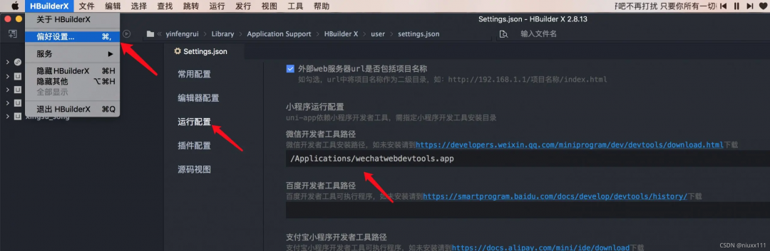8.下载hbuilder和微信/QQ开发者编辑器,hbuilder 左上角点击偏好设置设置—–运行配置—-配置相对于的开发工具路径,windows大家自己找找