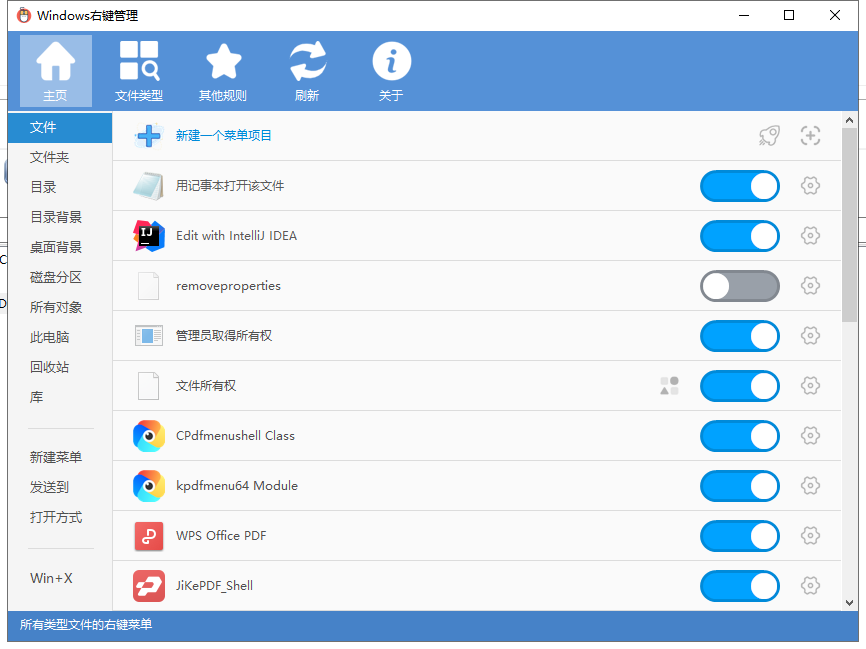 支持文件、文件夹、磁盘等位置的右键菜单项目增删,新建子菜单项增删、发送到子菜单项增删、打开方式子菜单项增删,自定义​扩展名文件右键菜单项目增删功能。