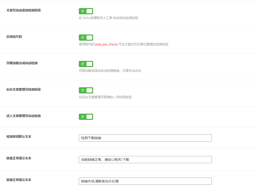 前端短代码可设置开启短代码 [mel_pan_check] 在文章内任意位置增加检测按钮