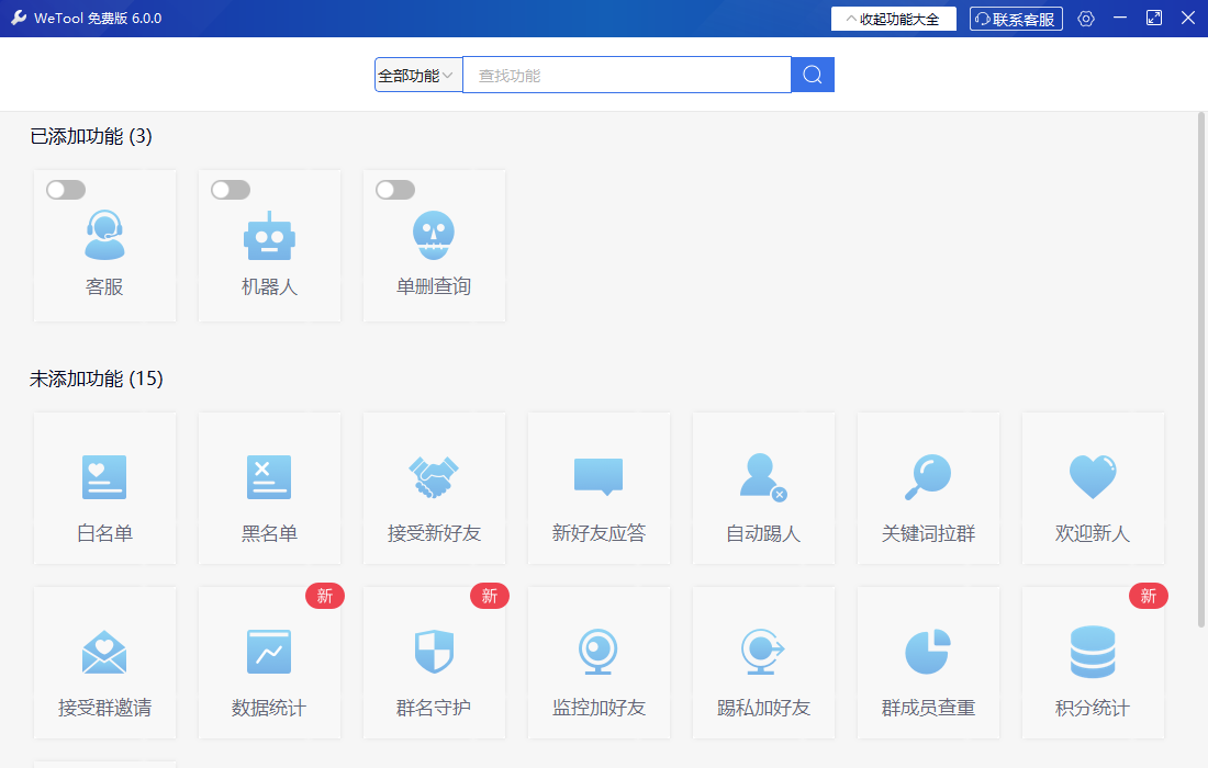主要功能有:客服、机器人、单删查询、接受新好友、自动踢人、关键词拉群、欢迎新人等;