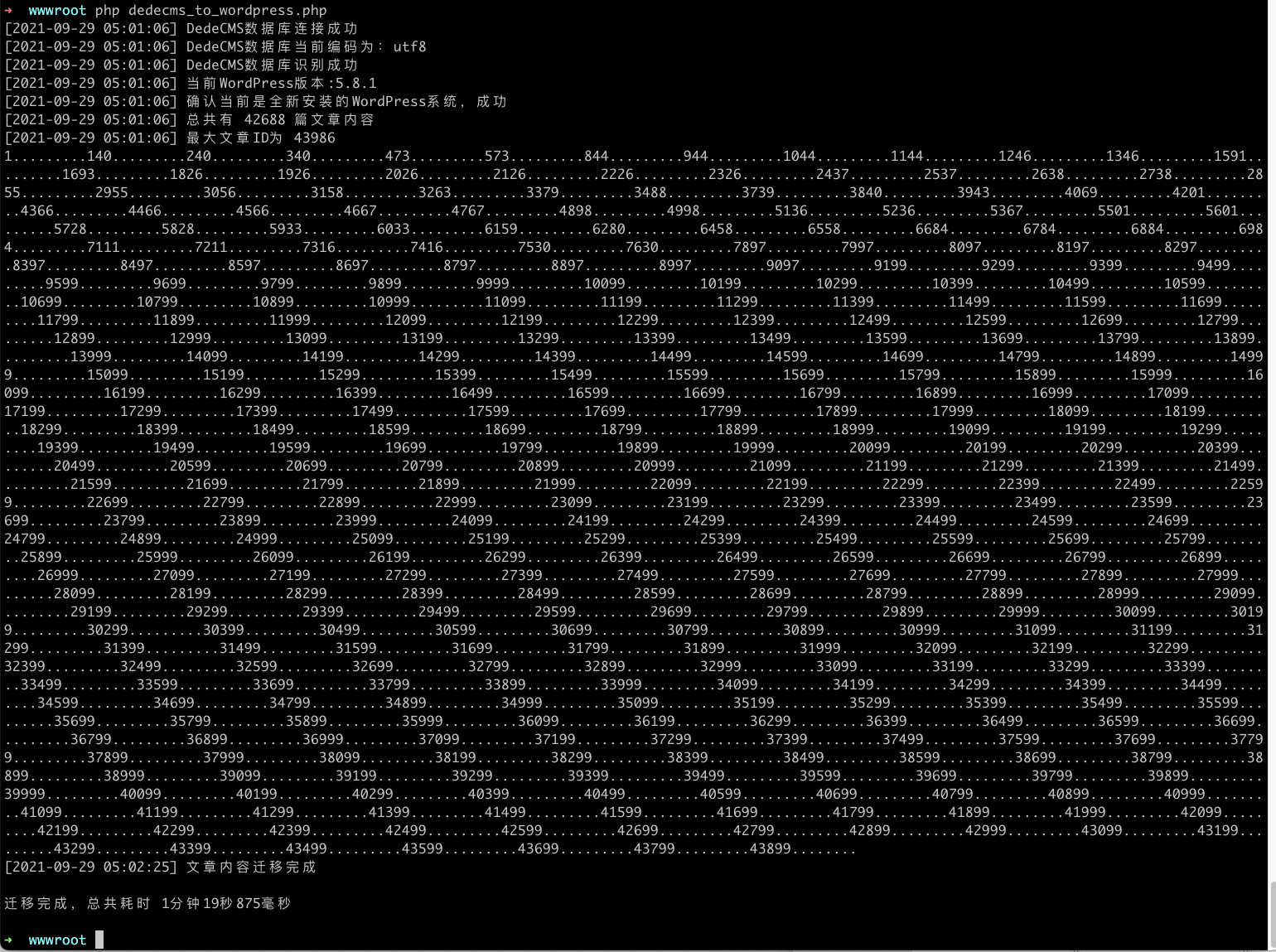 将刚刚修改好的 dedecms_to_wordpress.php 文件上传到刚才全新安装的 WordPress 目录,然后在 SSH 命令行执行下面的命令: